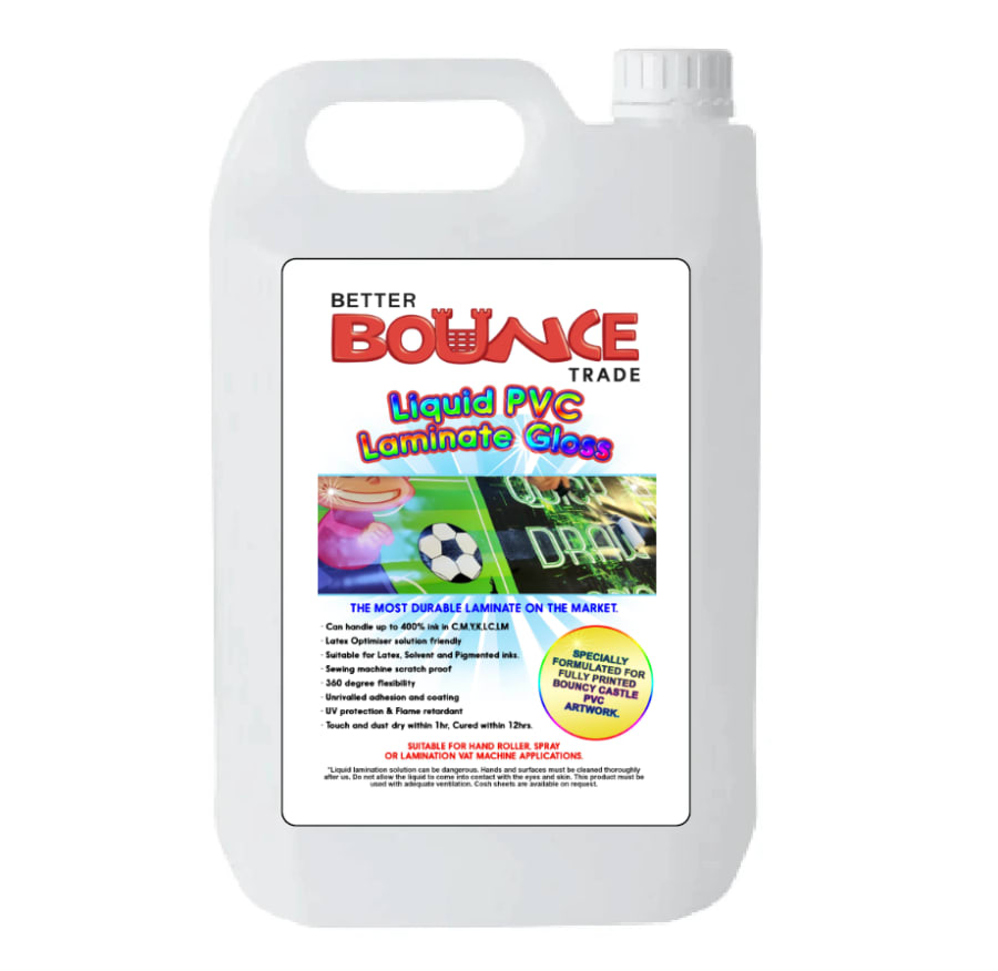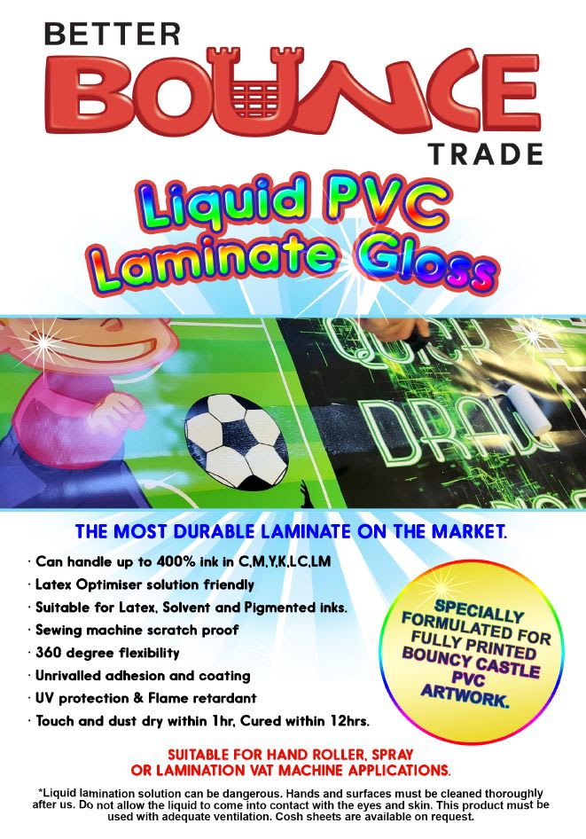 The liquid laminate is formulated for bouncy castle artwork. It's been tried and tested on Betterbounce China PVC, Inflamat, Frank Pines, Coated Applications and lots of the welsh suppliers.