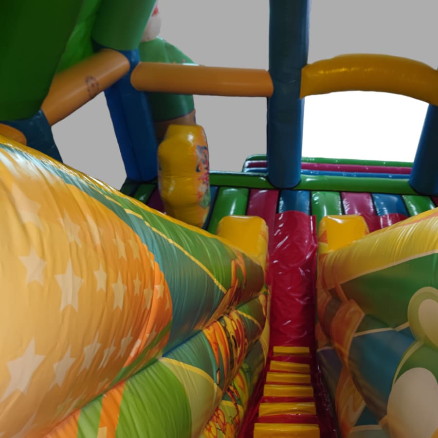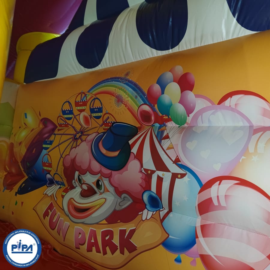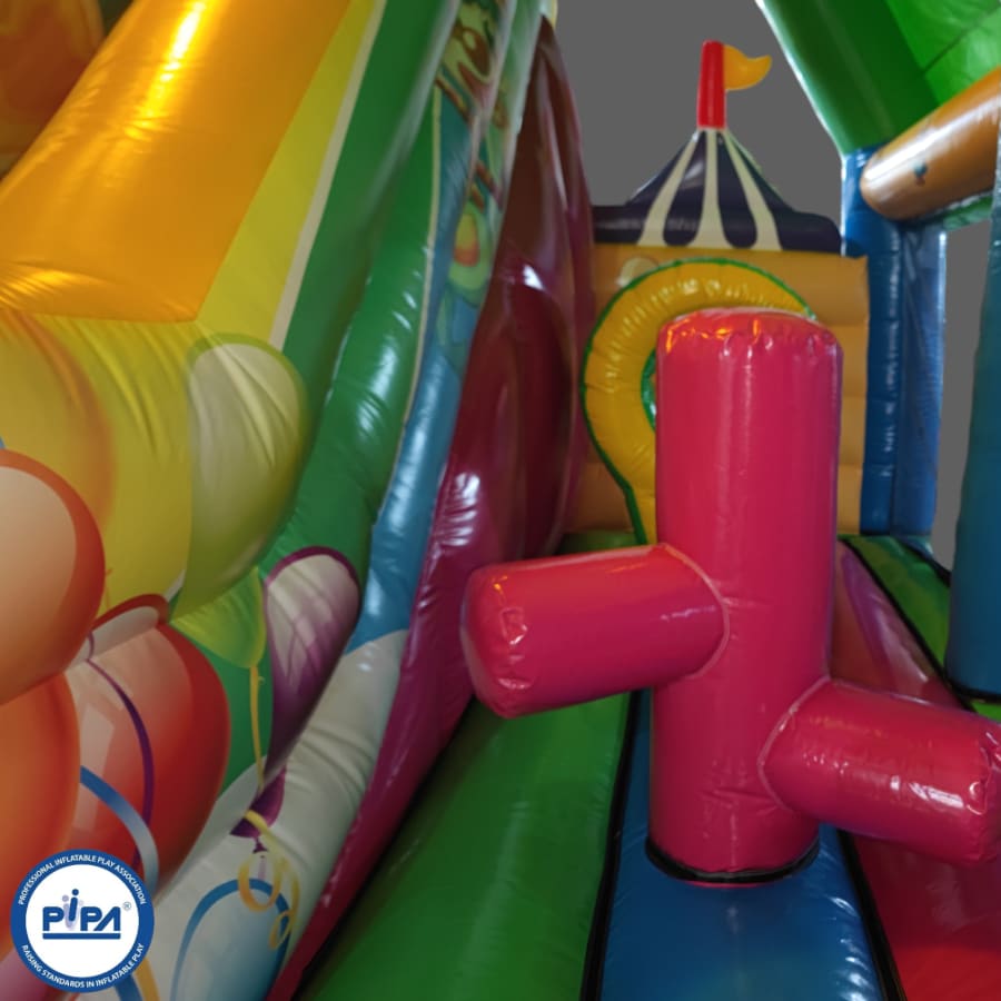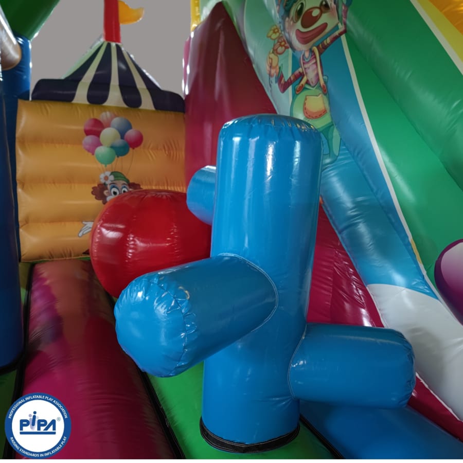 In the heart of the circus-themed wonderland, a thrilling 10ft platform slide takes center stage, offering an exhilarating ride for all who dare to climb to the top. But that's just the beginning! Our multiplay bouncer is packed with engaging activities, including inflatable biff and bash pillars, colorful obstacles to explore, and an array of fun challenges.