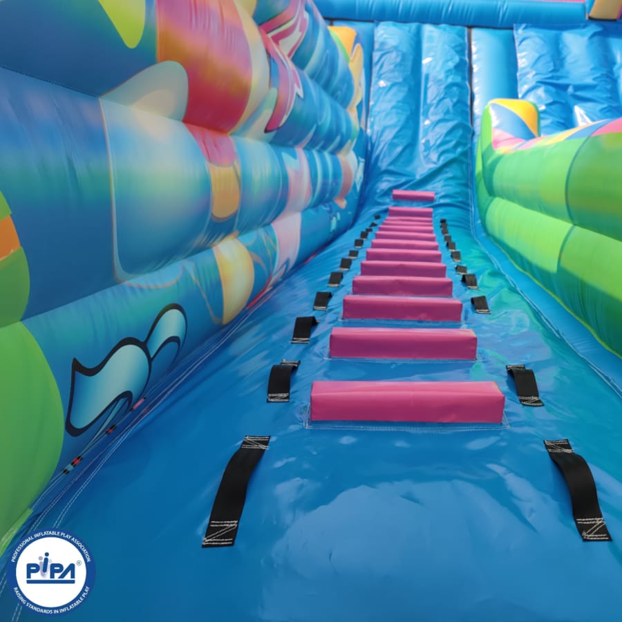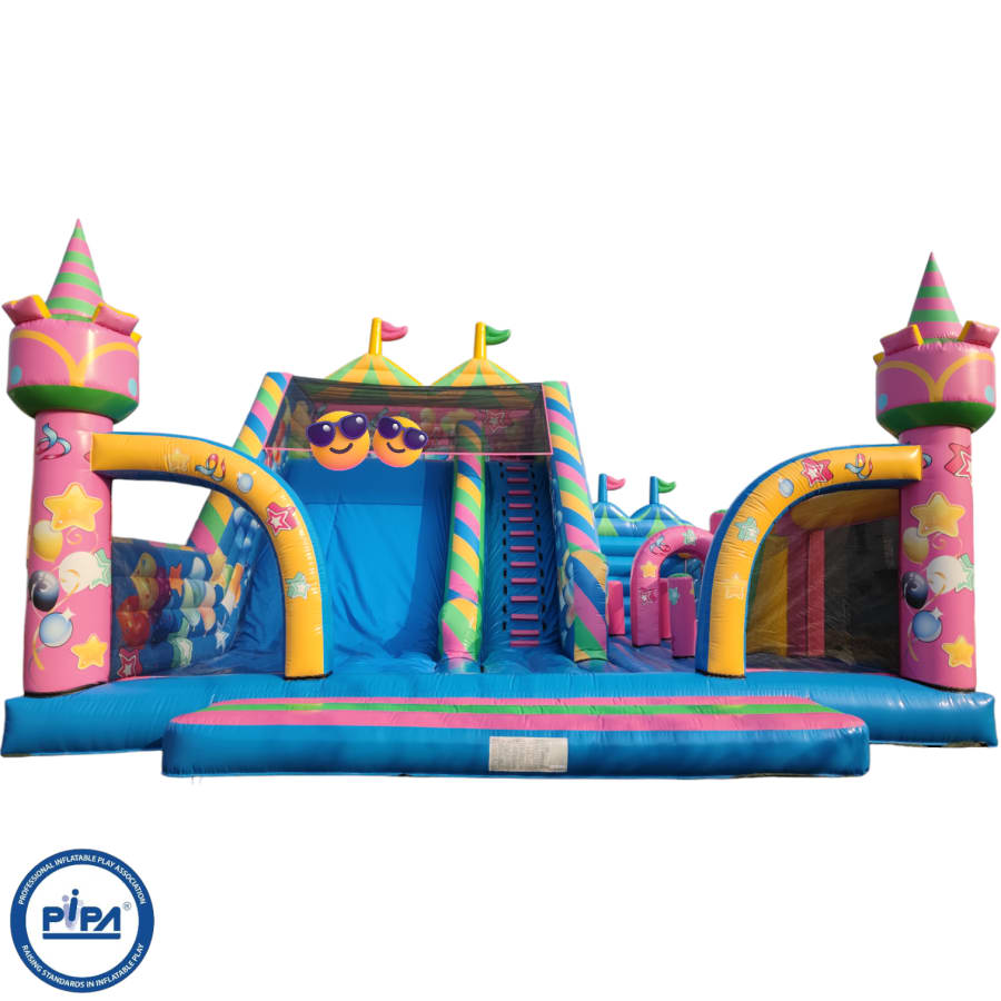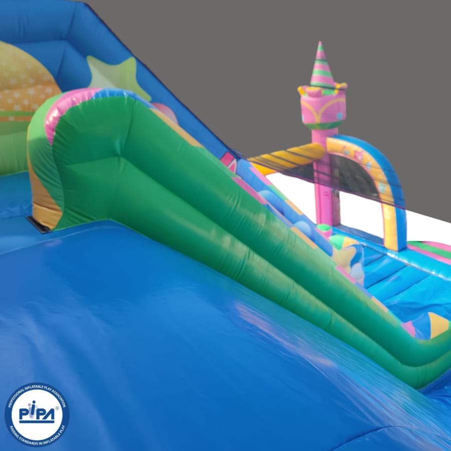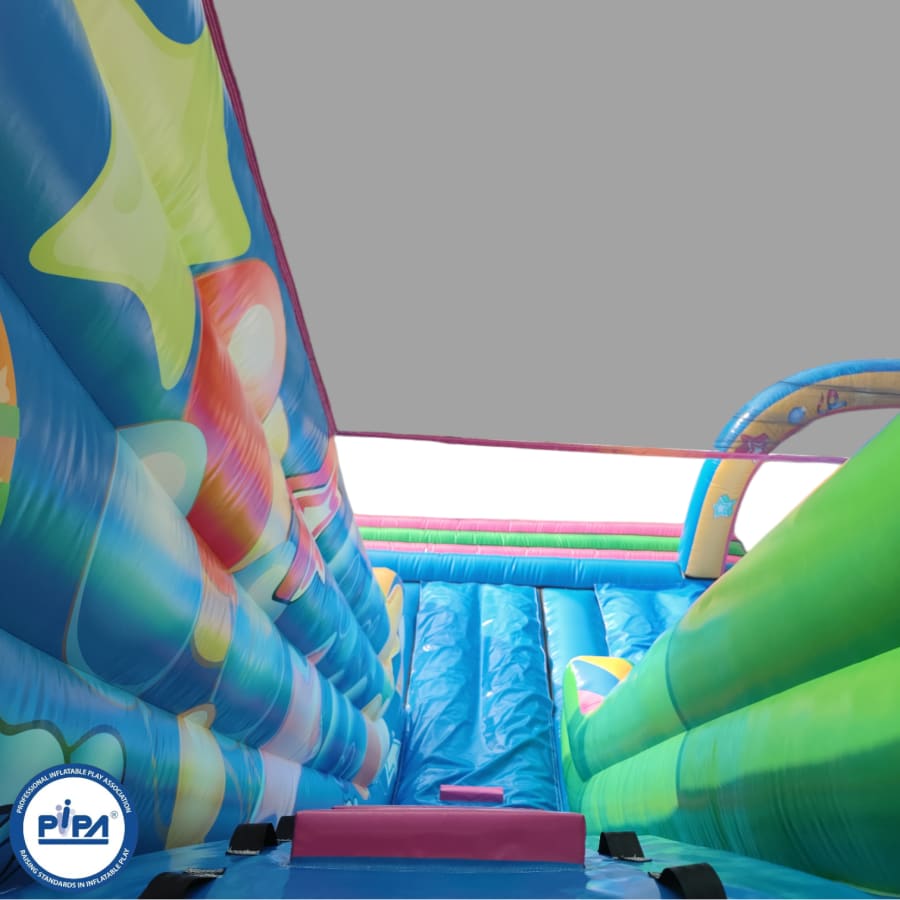 Central to this balloon-filled paradise is a thrilling 13ft platform slide, adorned in ice blue, yellow, and green hues, ready to whisk adventurers on an exciting descent. But the excitement doesn't end there! Our multiplay bouncer boasts a plethora of engaging activities, from inflatable pillars to colorful obstacles, promising endless entertainment for all ages.