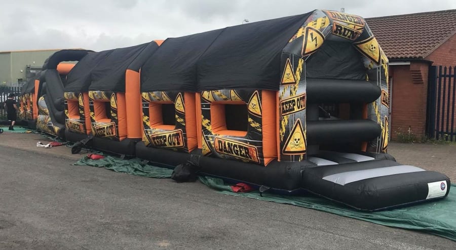 The all new Danger inflatable obstacle course for hire measure in at whopping 87ft in length yet is still perfect for both indoor and outdoor hire. 87ft is a brilliant length making it suitable for most domestic parties, pubs, clubs, schools, galas, scouts, cubs, guides and other community groups aiming to keep children entertained for longer periods of time than the standard bouncy castle for example.
