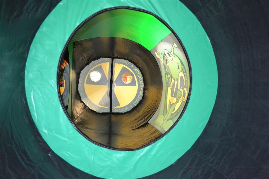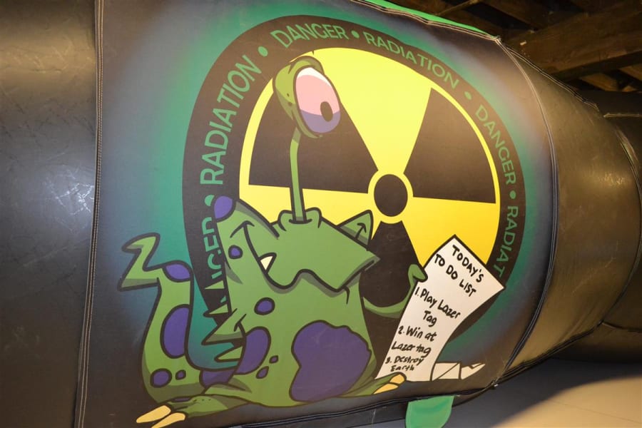 Internally the arena is constructed of interconnected chambers forming a simple maze, which for most of its area is over 6 feet high. These doorways help you hide away from your opponents and score those ever so valuable extra points. To enhance the visual effect of the lasers and fog (not included) & to add the excitement inside the arena it is gloomy with brightly coloured doorways and hide behinds.