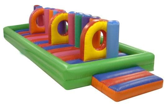 This particular piece in a single player piece filled with biff and bash posts, climb through hoops and other obstacles. Its a very traditional piece and its a real good attraction when operated as part of a team relay race or when covered in bubbles or foam solution. Complete with safety step to aid access and agrees at either end of the inflatable and dwarf walls to help contain the users in the event of a slip.