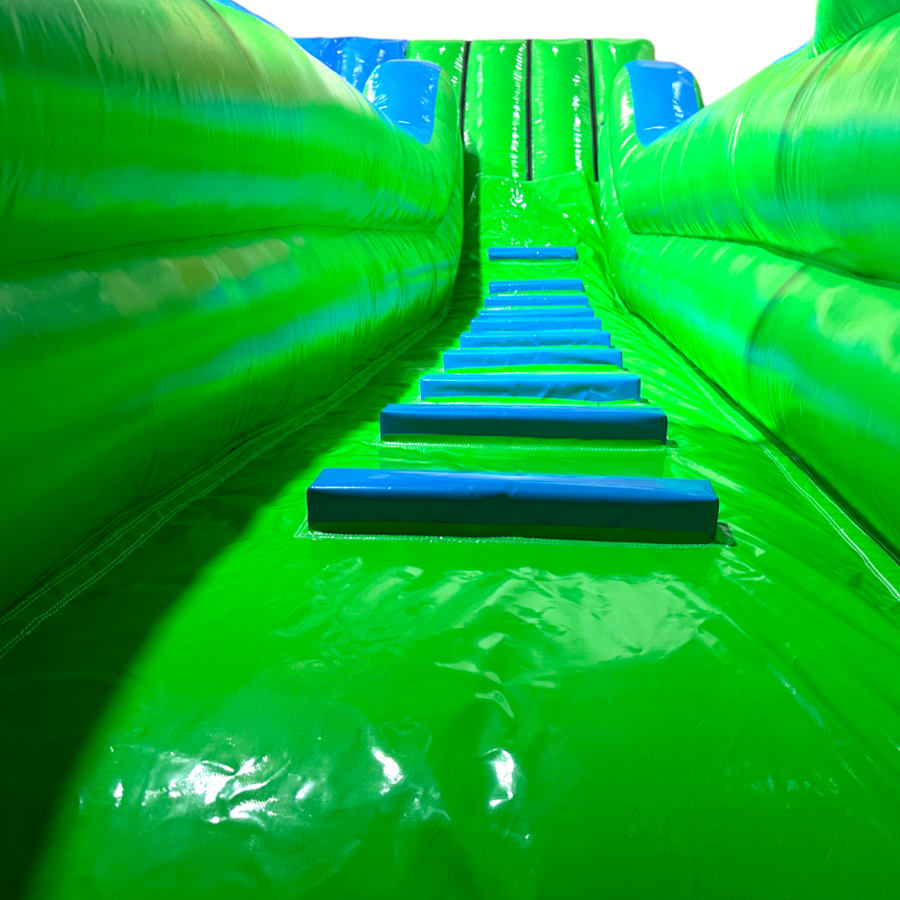 - The platform on this inflatable slide has been reduced in width by 60% to accommodate single-file use by children, reducing weight by approximately 45kg.