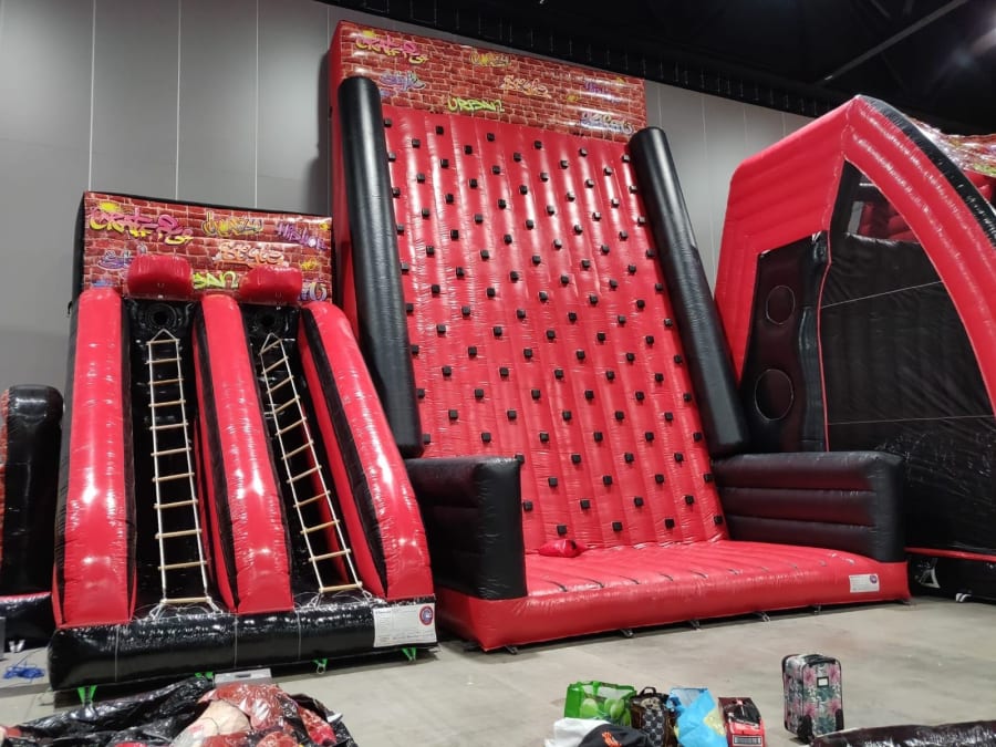 - Inflatable Climbing Wall, 2 x fall arrest block (inc Safety Certification), 2 x Harness, 2 x retrieval ropes and 2 x helmets