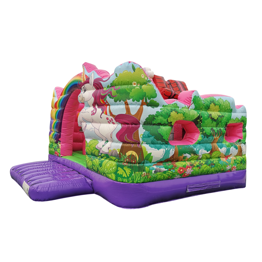 The slides roof features a special viewing tower for the little ones to get excited over and despite this, only measures at a modest 11ft yet making it perfect for indoor hire. The Unicorn artwork theme really is amazing and gives an extra vibrant feel to all other items in its class. The vibrant unicorn artwork is very realistic and absolutely fantastic quality, ensuring this inflatable slide is perfect to make your little one's big day