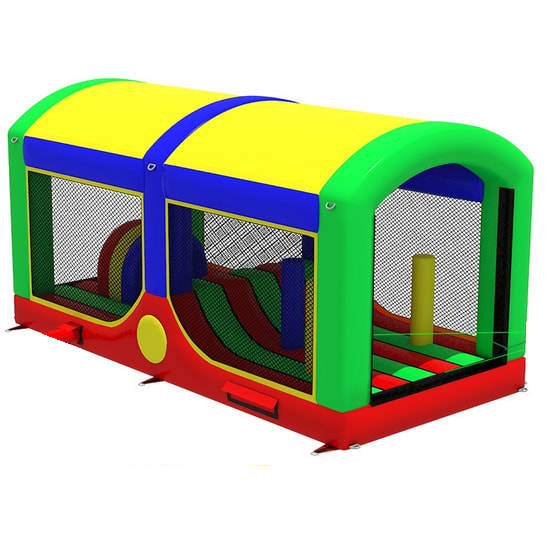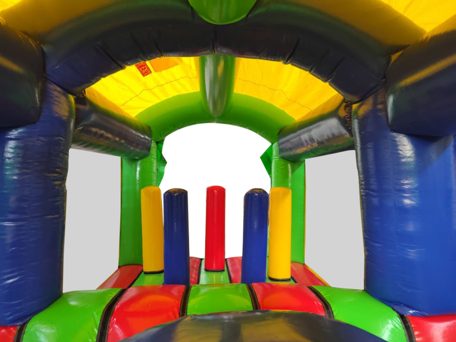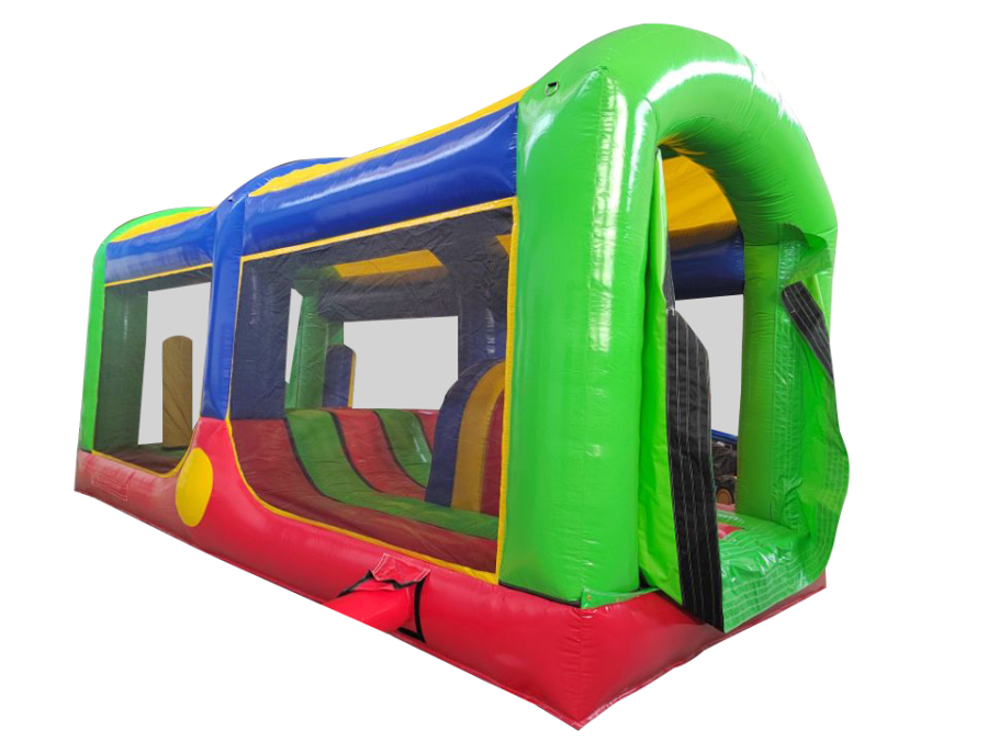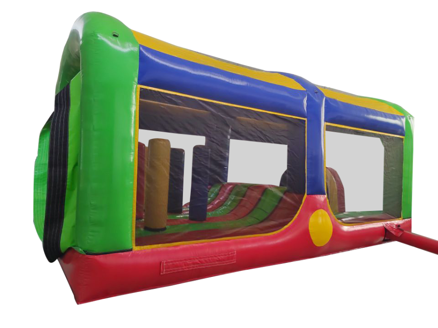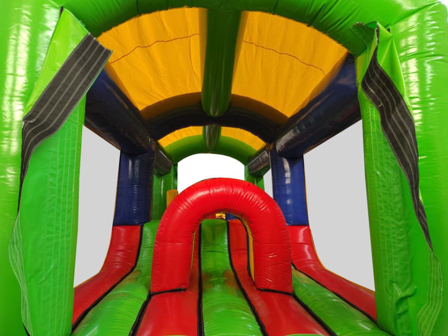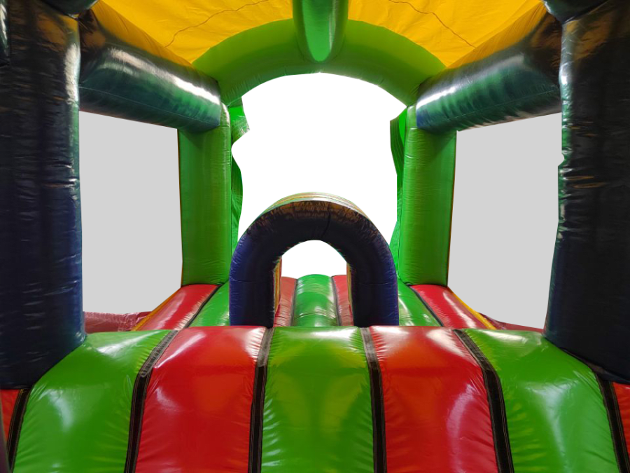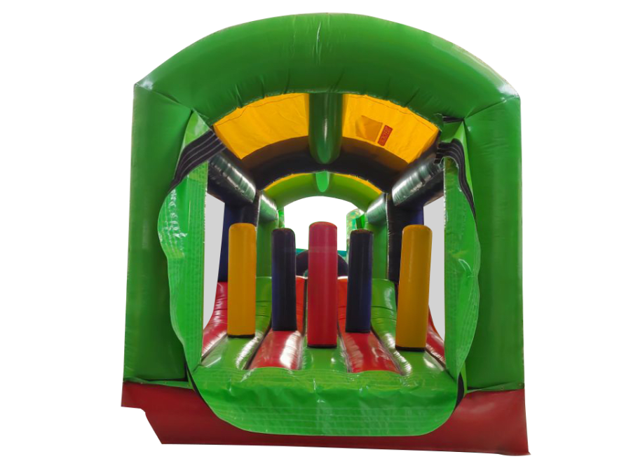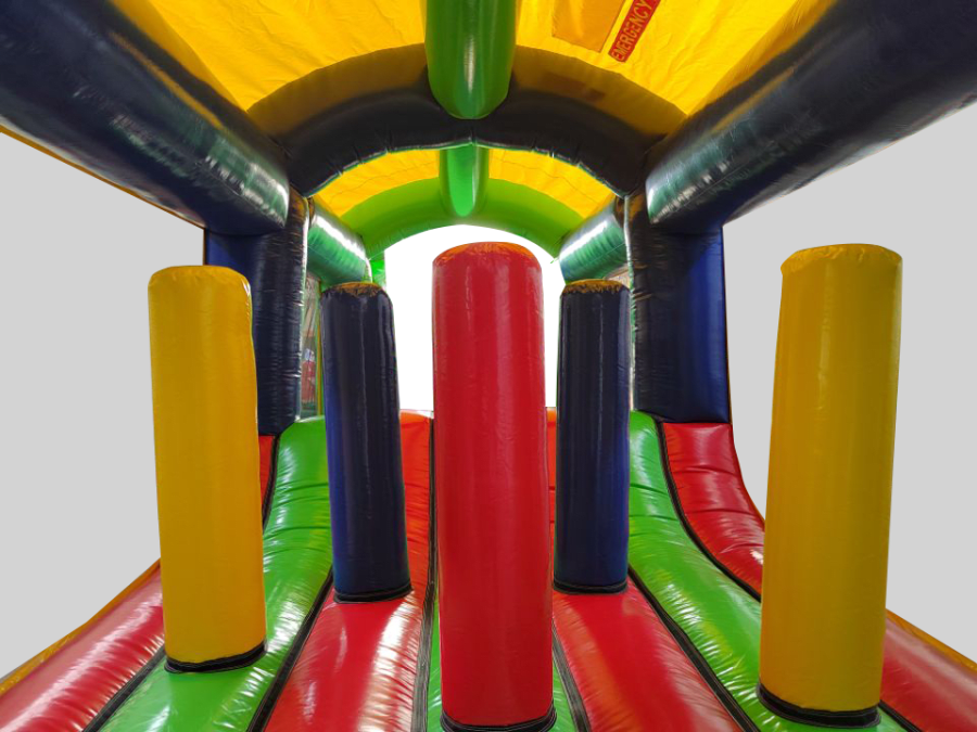 All extension pieces are designed to be located in the middle of the obstacle course and this exact listing is for 1x inflatable extension compromising of Crawl tunnel, crazy hump and biff and bash pillars in the middle. The piece is universal so can be rotated to aid with a quick and easy set up. The blower tubes are located next to one another to give a better set up on site in terms of blower and cable management.