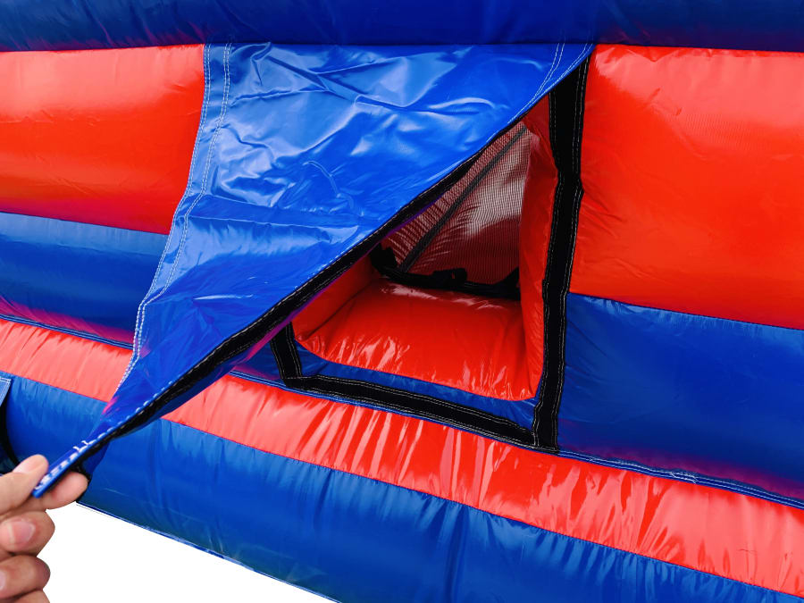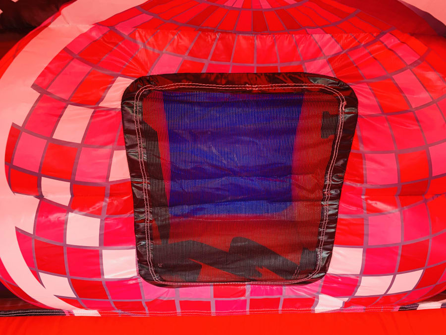 The Inflatable Disco Castle comes with a lighting slot in the top that accepts most kinds of disco lighting, this is placed inside a clear plastic tube that allows light to penetrate inside the castle creating some really good effects inside. The slot is then zipped closed and a velcro cap is placed over to keep it watertight but please bear with us in heavy rain as nothing is quite 100% waterproof