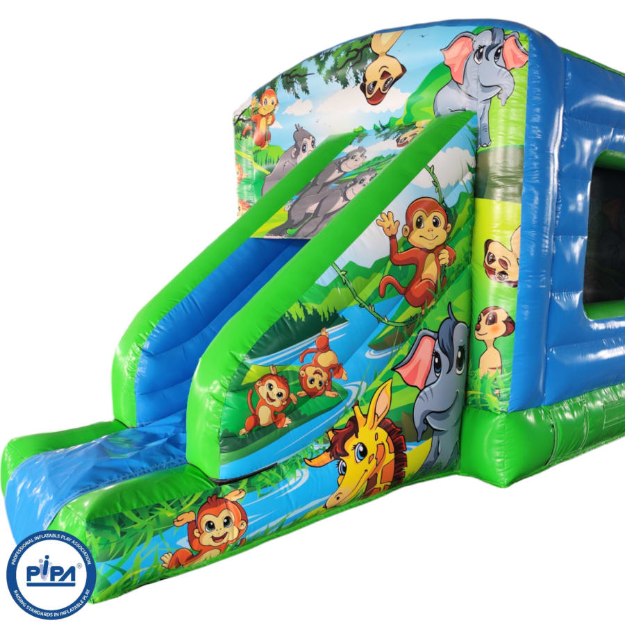 The 12ft x 17ft Bouncy castle with slide is a fantastic new addition that can be added to your fleet. The bouncy castle with slide combines 2 of the most popular items in one extraordinary inflatable where space is at a premium. The bouncy castle with slide combo is the perfect combination slide for any party, venue or occasion and is ideal for all age groups. This brightly coloured piece of equipment provides the perfect bouncing area to bounce along with friends, whilst the slide provides entertainment for the rest of the guests at the same time and certainly won't break the bank.