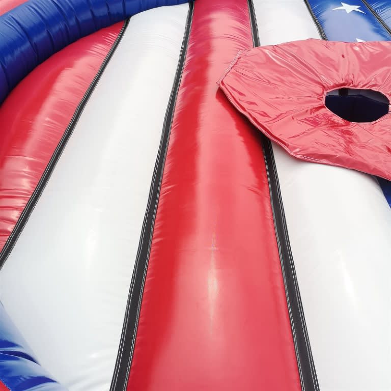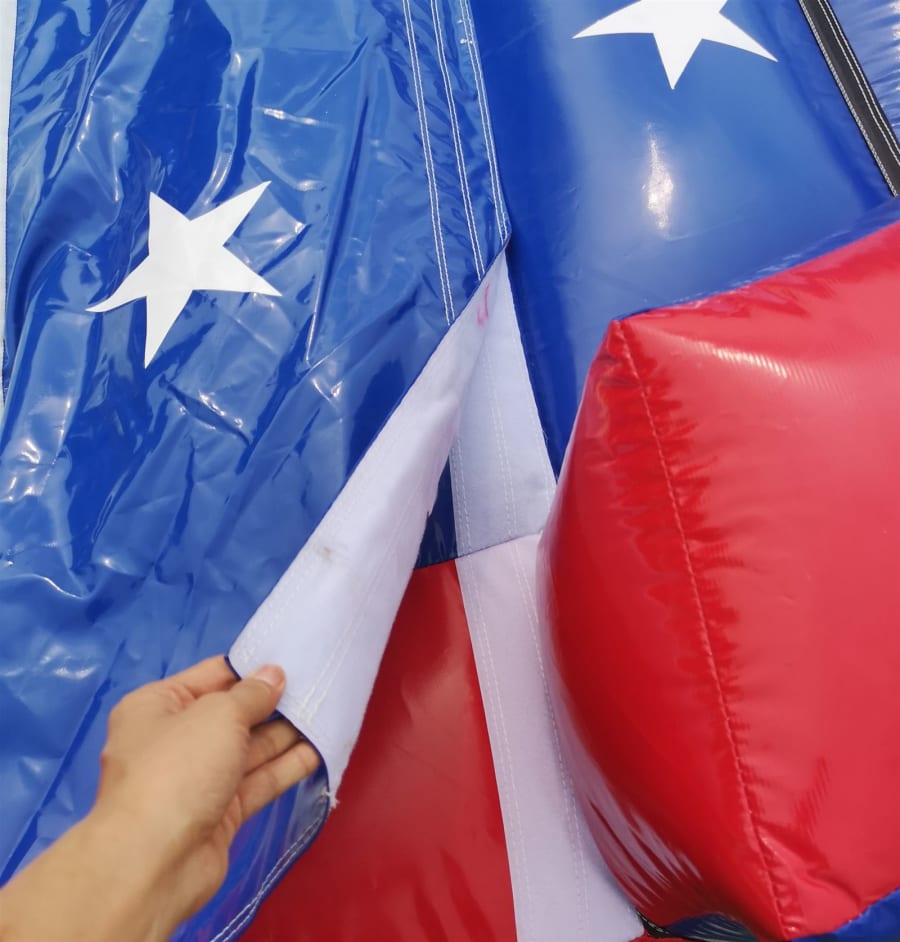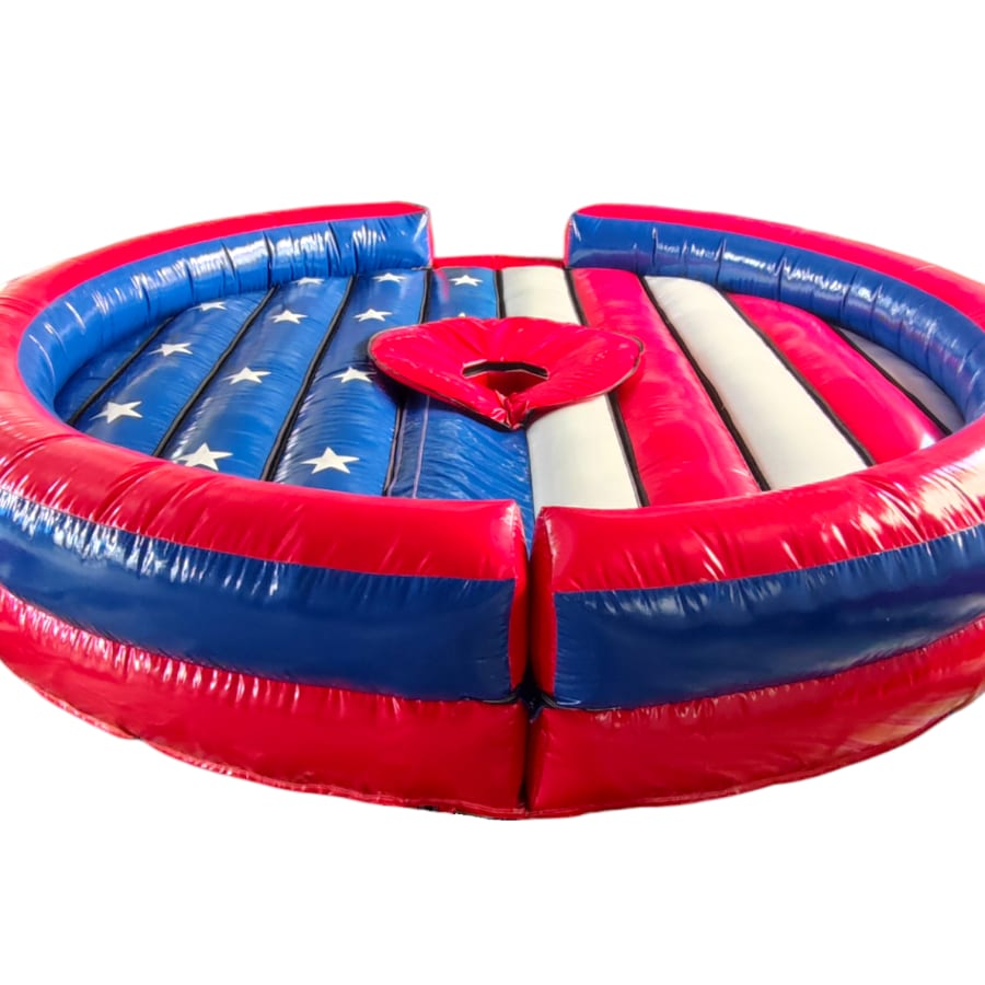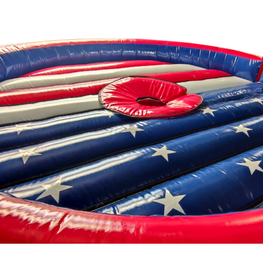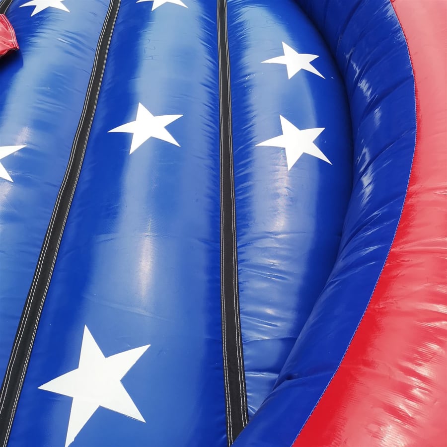 The inflatable bed features vibrant red, white, and blue coloring with a star pattern, giving it a fun and visually appealing design that suits a variety of event themes. Its sturdy construction can handle the rigorous demands of frequent use, making it perfect for both personal and professional needs. Each unit comes with a complete accessory package, including ground pegs, a durable peg bag, and a safety fall pad, ensuring the system is secure and ready for action straight out of the bag.