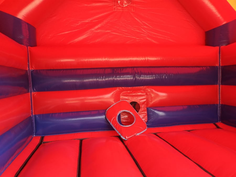 The Inflatable Disco Castle comes with a lighting slot in the top that accepts most kinds of disco lighting, this is placed inside a clear plastic tube that allows light to penetrate inside the castle creating some really good effects inside. The slot is then zipped closed and a velcro cap is placed over to keep it watertight but please bear with us in heavy rain as nothing is quite 100% waterproof