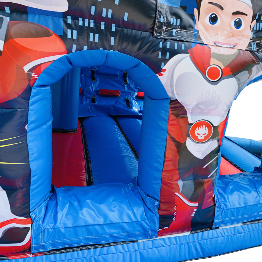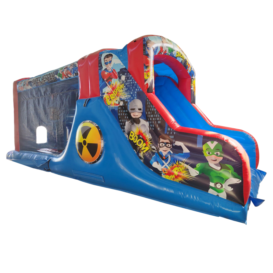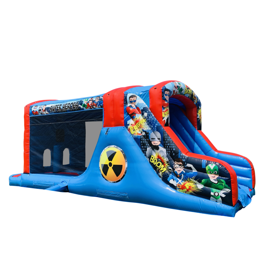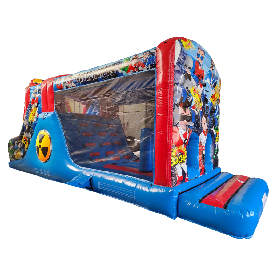 Make your child's day with this modern obstacle section. The inflatable obstacle course offers a safe entrance way with full theming, followed by a series of biff and bash pillars, cool chill out area in the middle, steep ladder climb and a crazy slide out of the end. The obstacle course is the perfect choice for your little one's birthday party school gala, summer fete and works fantastically as a stand alone item or as part of a larger package of matching inflatables.