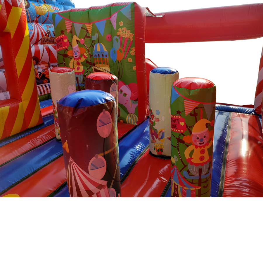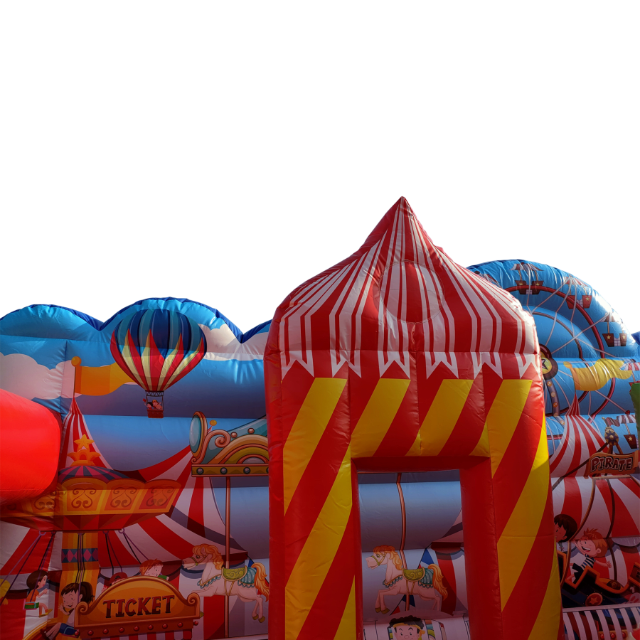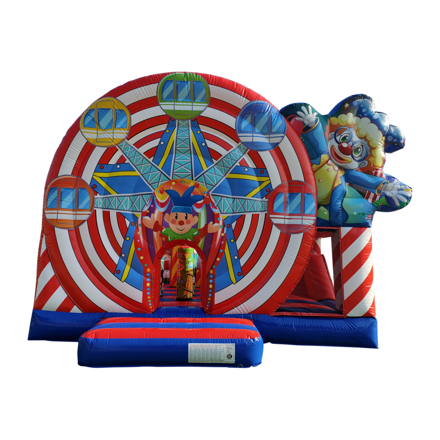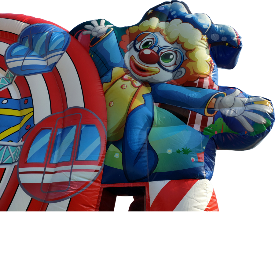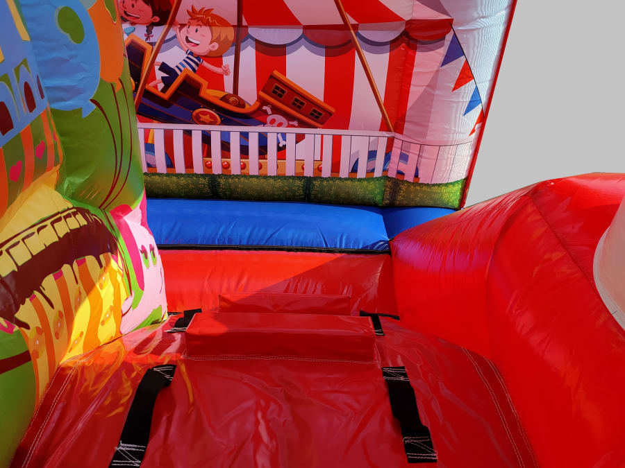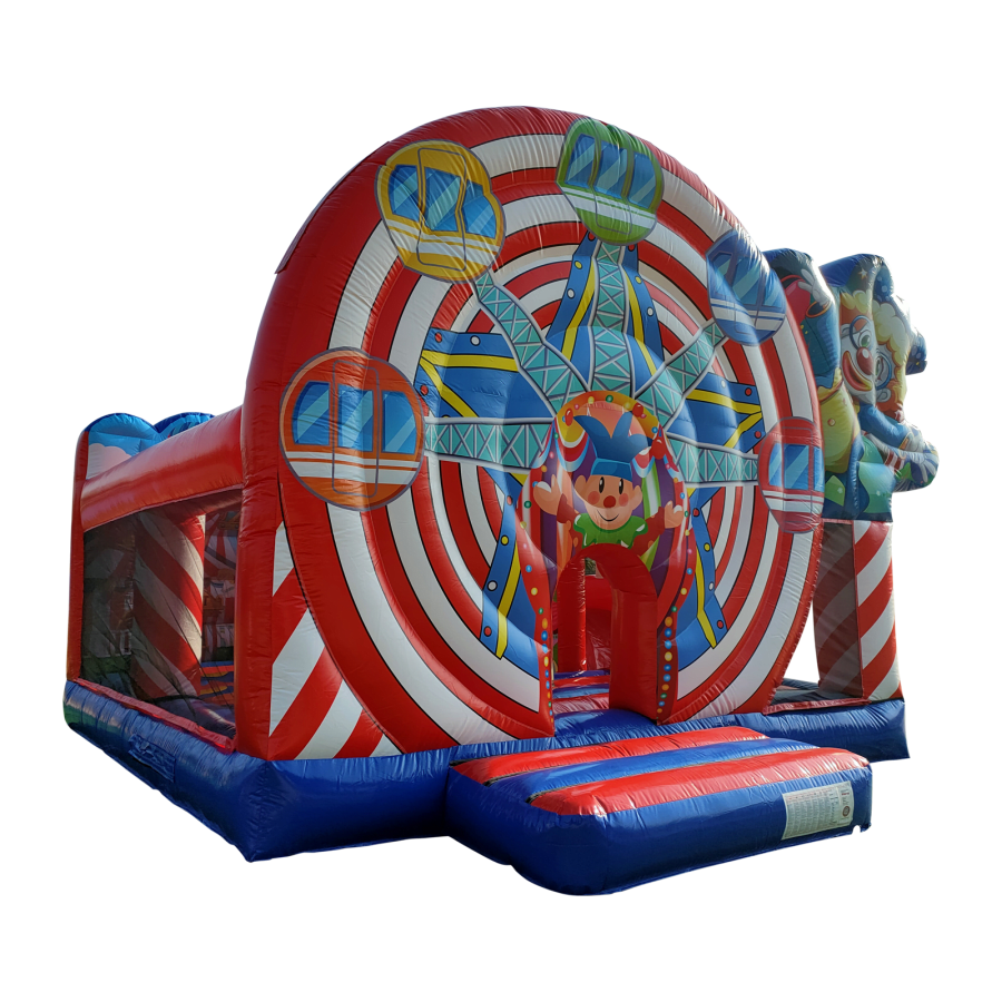 The inflatable funfair is themed up to replicate the look of the old town Fun-house seen at traditional fairgrounds worldwide and it's bound to bring all these childhood memories flooding back. It features a twister game style pay bed, carousel themes side wall, A circus stage arena, A punch and Judy style side stall, Interactive biff and bash pillars & features a slide in the corner and generally just an amazing funfair themed inflatable with an added bonus of a fully adult compliant bouncy castle designed specifically for all you big kids in life.