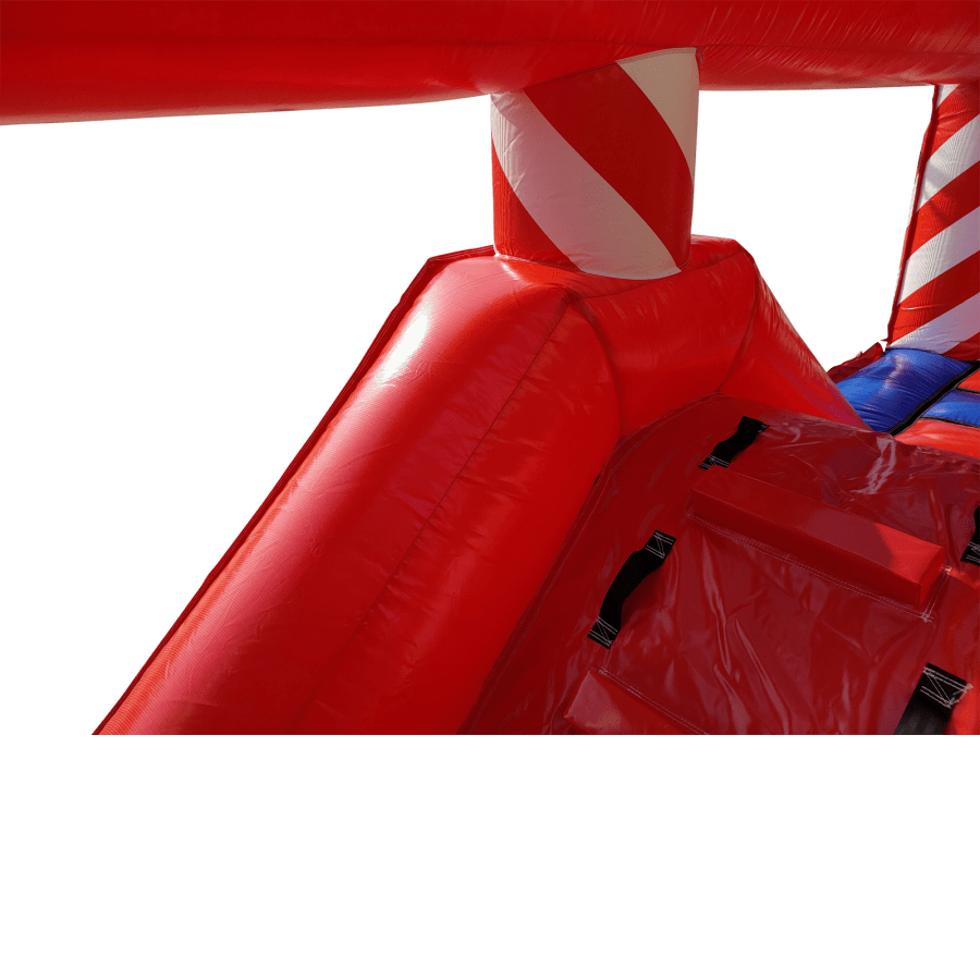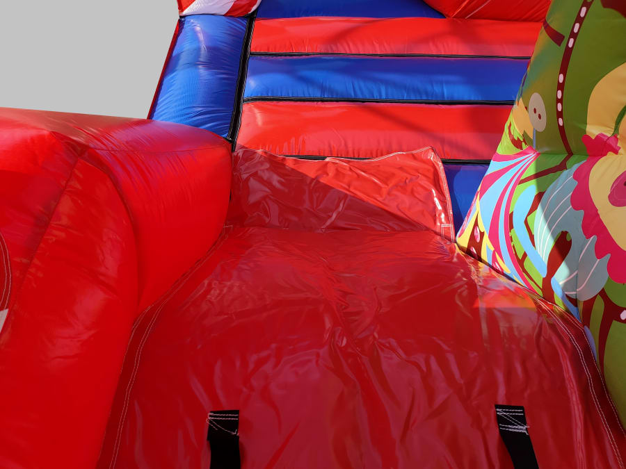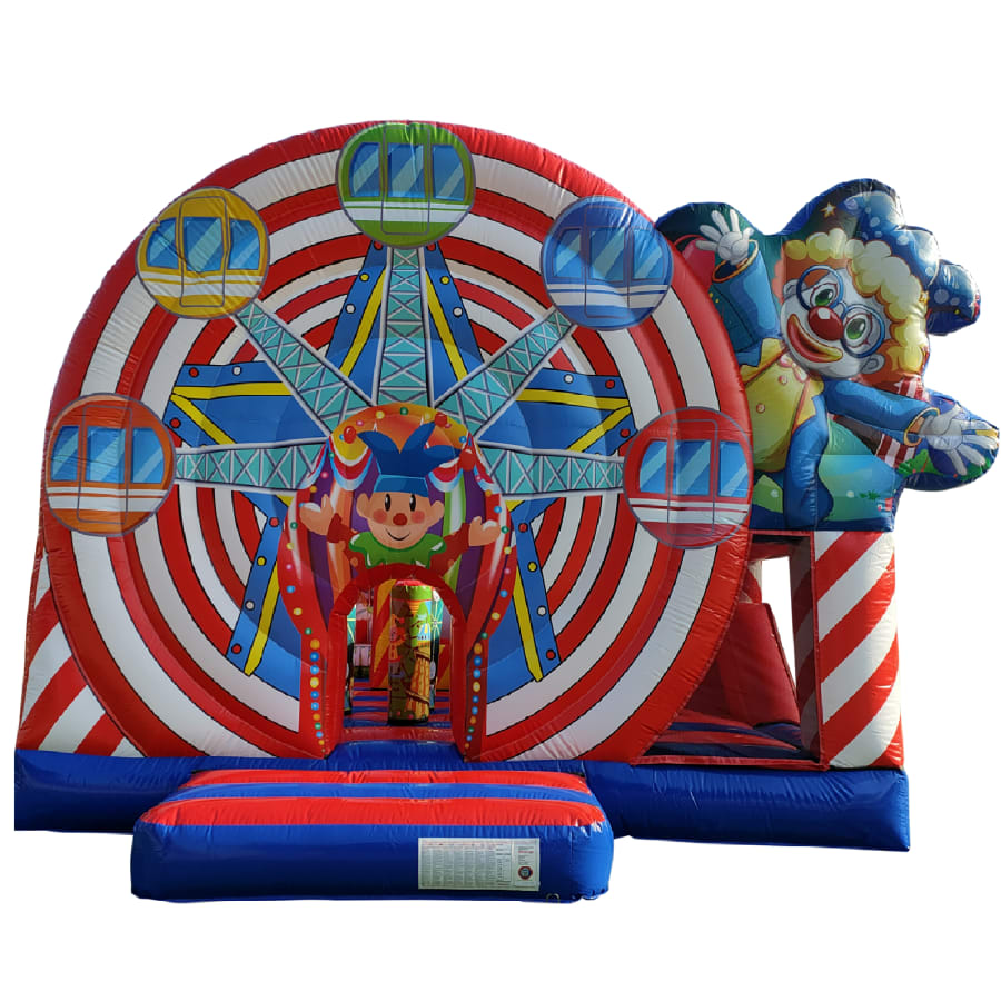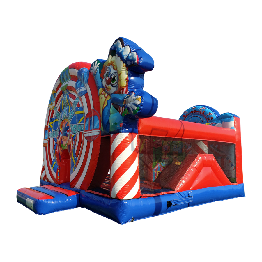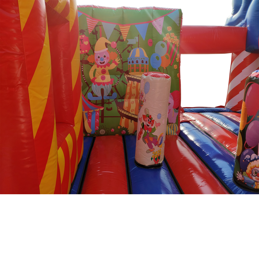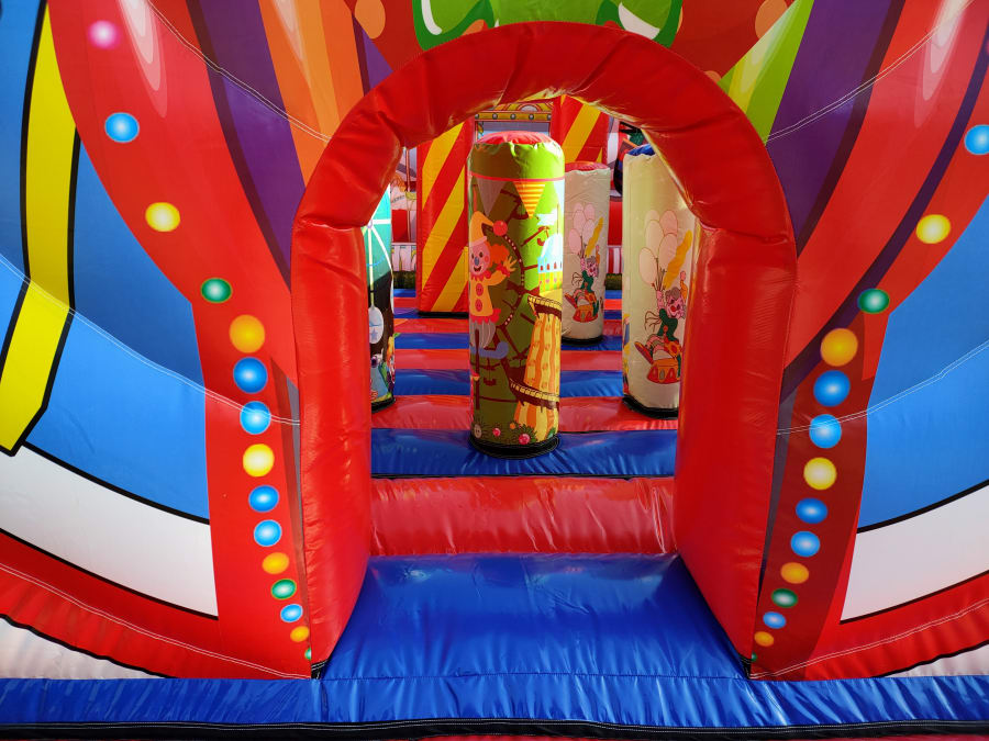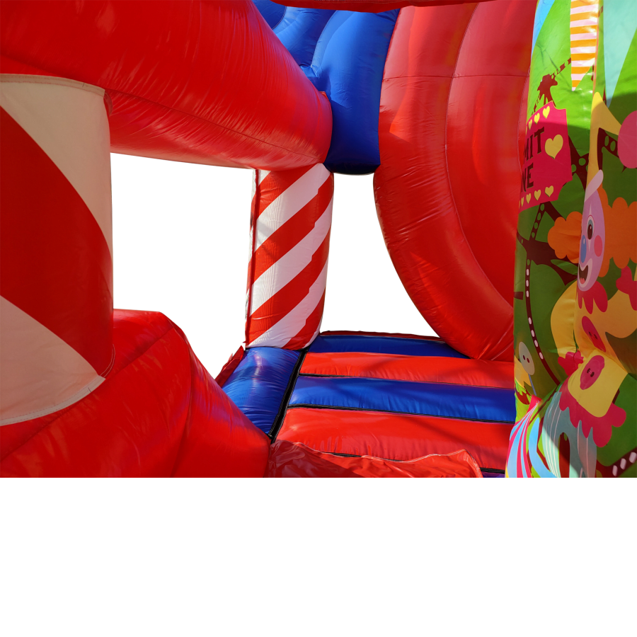 The inflatable funfair is themed up to replicate the look of the old town Fun-house seen at traditional fairgrounds worldwide and it's bound to bring all these childhood memories flooding back. It features a twister game style pay bed, carousel themes side wall, A circus stage arena, A punch and Judy style side stall, Interactive biff and bash pillars & features a slide in the corner and generally just an amazing funfair themed inflatable with an added bonus of a fully adult compliant bouncy castle designed specifically for all you big kids in life.