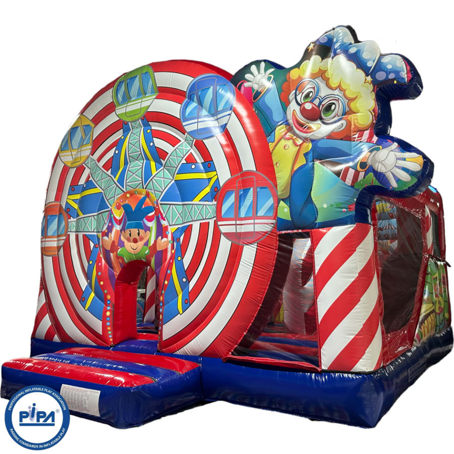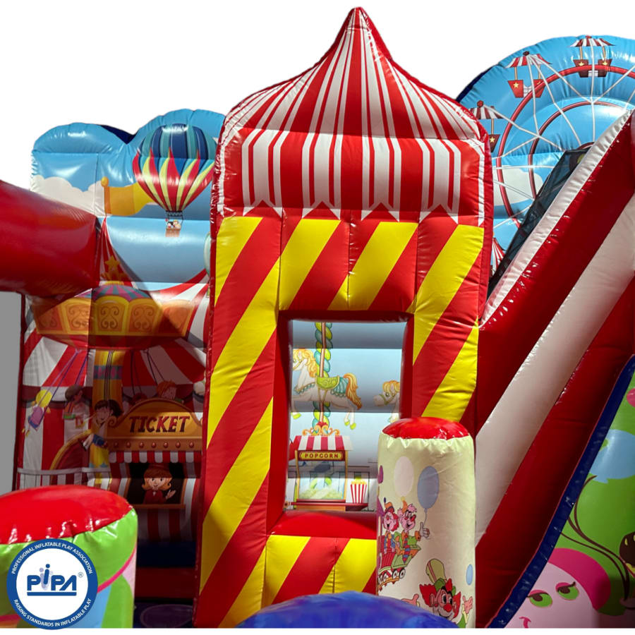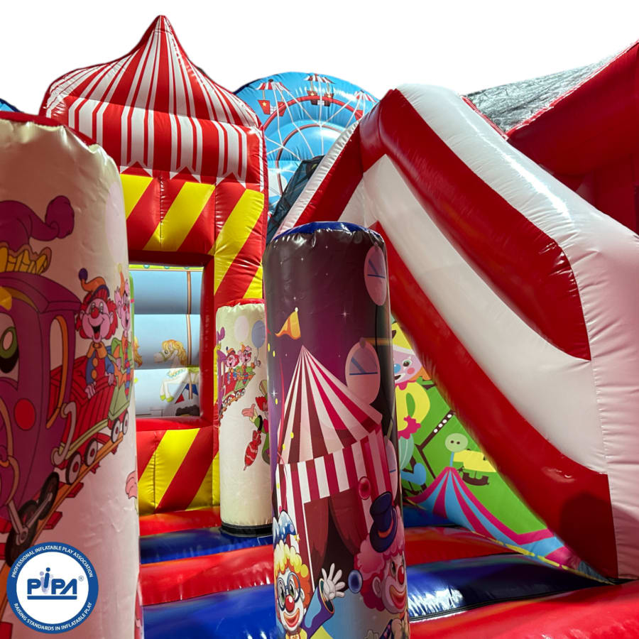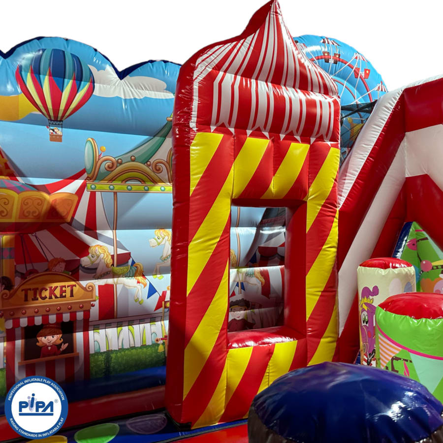 The inflatable funfair is themed up to replicate the look of the old town Fun-house seen at traditional fairgrounds worldwide and it's bound to bring all these childhood memories flooding back. It features a twister game style pay bed, carousel themes side wall, A circus stage arena, A punch and Judy style side stall, Interactive biff and bash pillars & features a slide in the corner and generally just an amazing funfair themed inflatable with an added bonus of a fully adult compliant bouncy castle designed specifically for all you big kids in life.