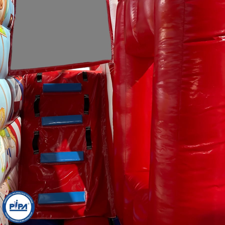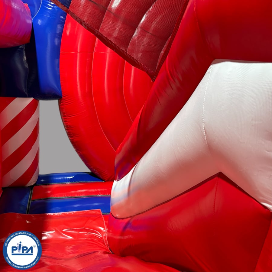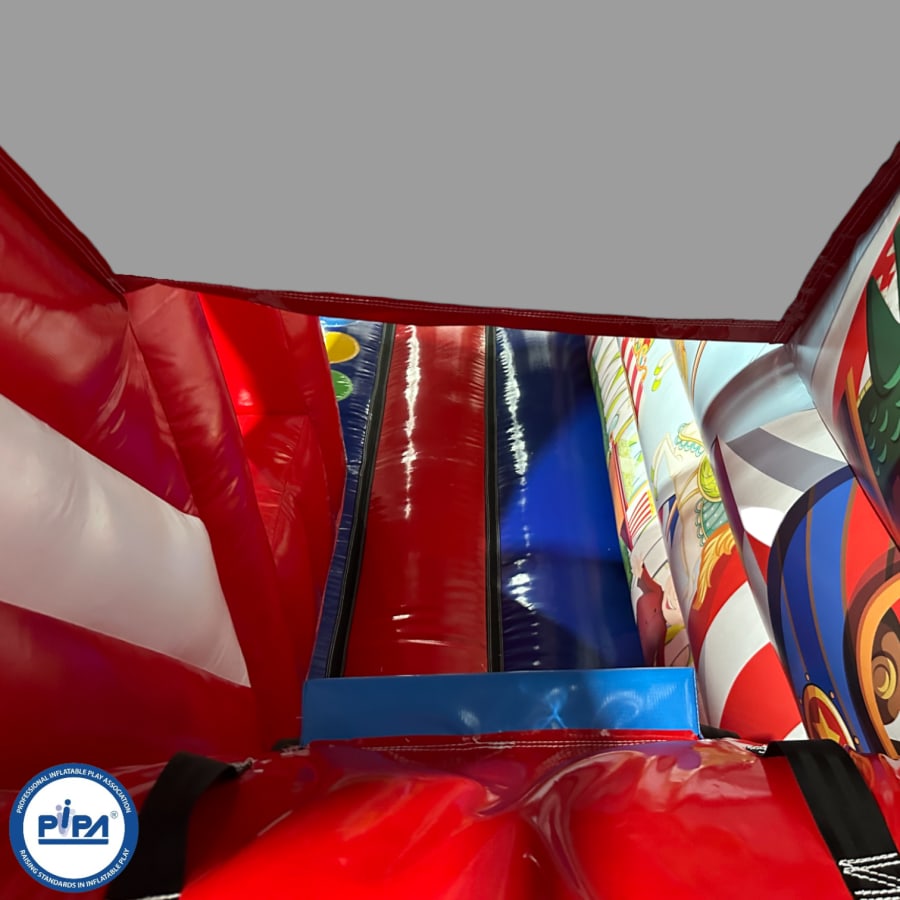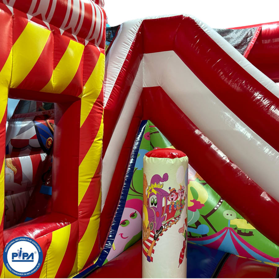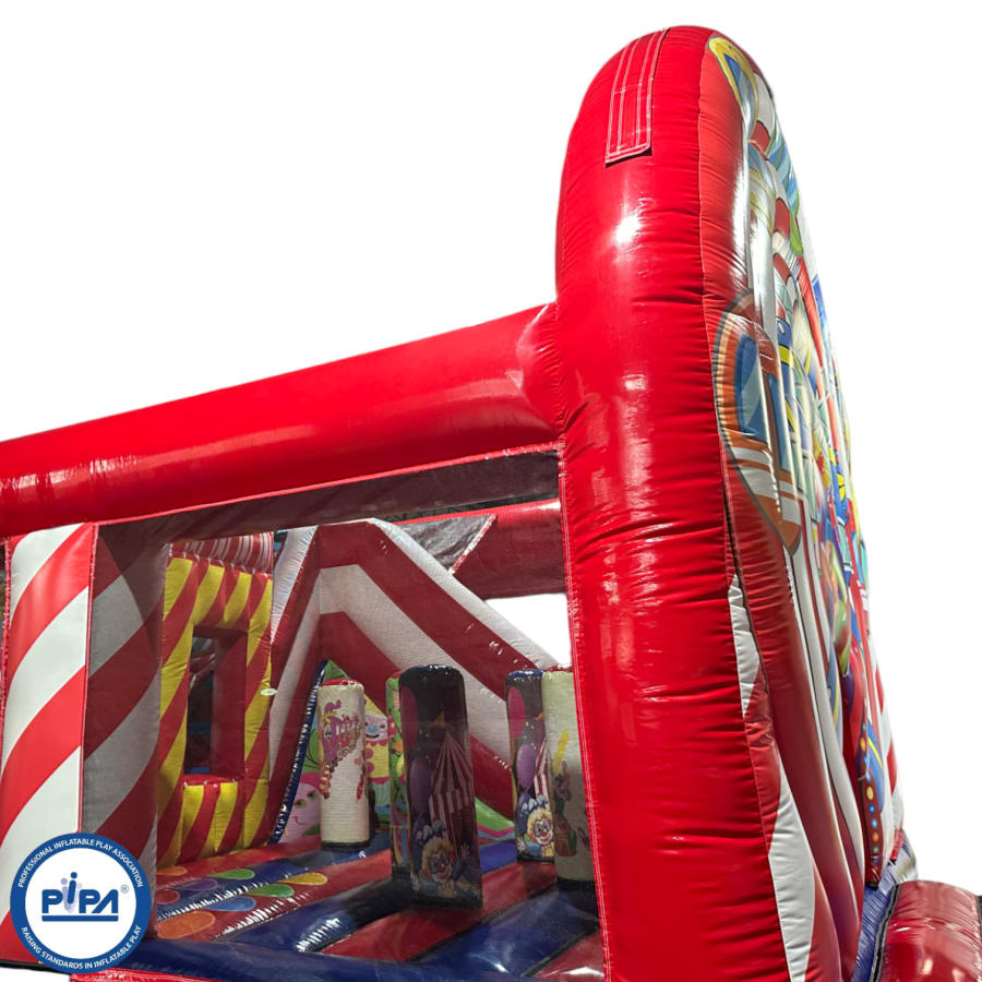 The inflatable funfair is themed up to replicate the look of the old town Fun-house seen at traditional fairgrounds worldwide and it's bound to bring all these childhood memories flooding back. It features a twister game style pay bed, carousel themes side wall, A circus stage arena, A punch and Judy style side stall, Interactive biff and bash pillars & features a slide in the corner and generally just an amazing funfair themed inflatable with an added bonus of a fully adult compliant bouncy castle designed specifically for all you big kids in life.