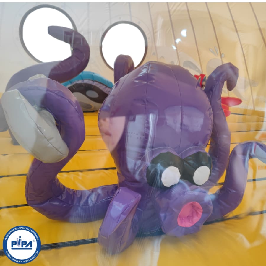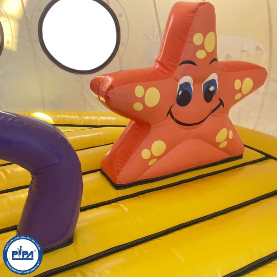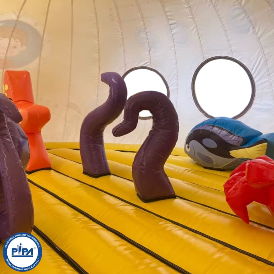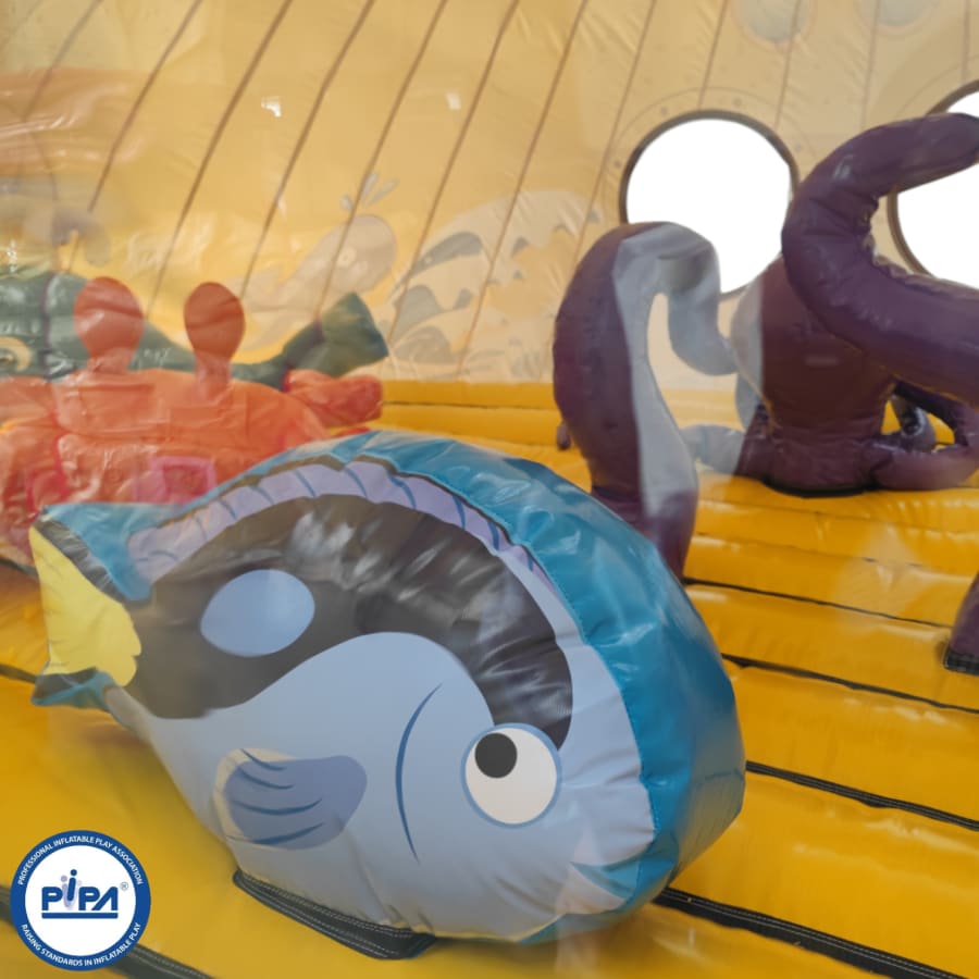 Prepare for an epic journey as you navigate through this extraordinary adventure. Begin your expedition with a safe and visually captivating entrance way that sets the tone for the undersea adventure ahead. Dive into a world of challenges, including biff and bash pillars resembling your favourite sea creatures, creating a dynamic and fun-filled sea world bouncy castle experience.