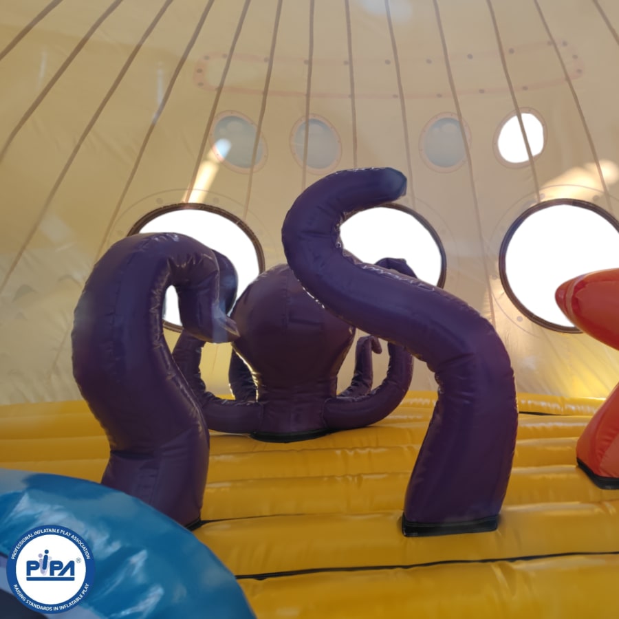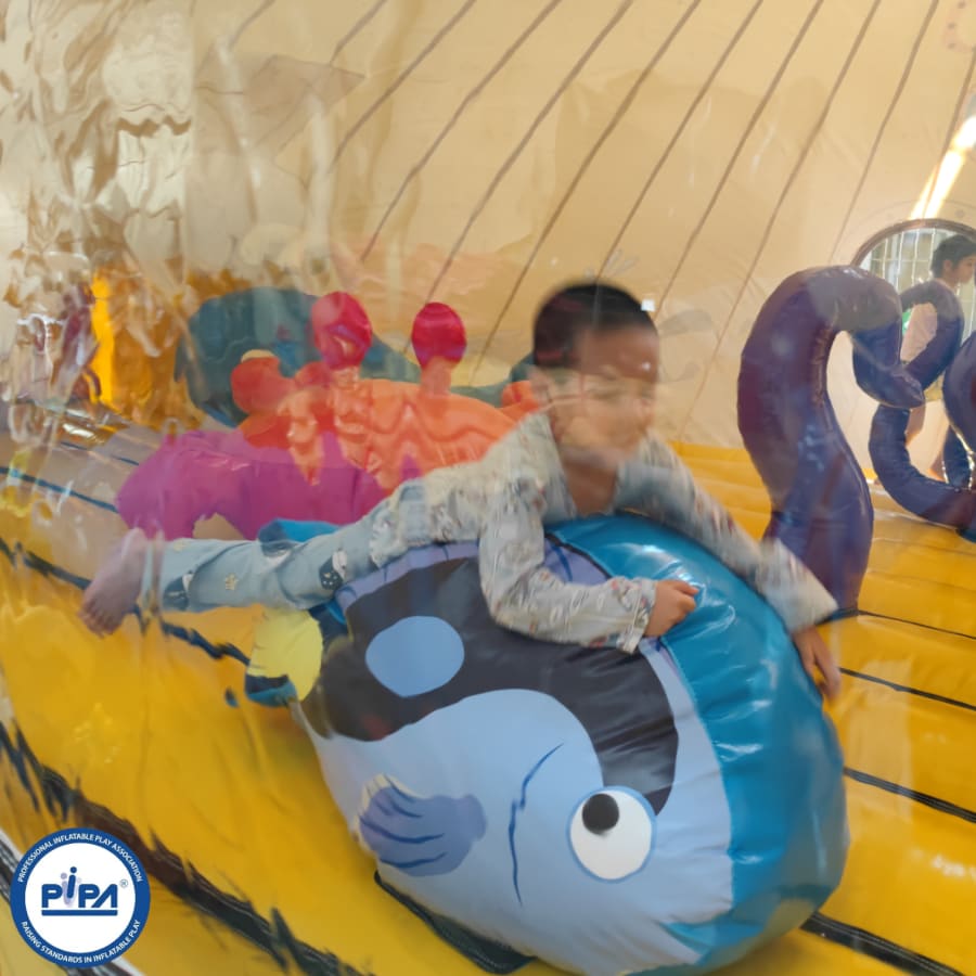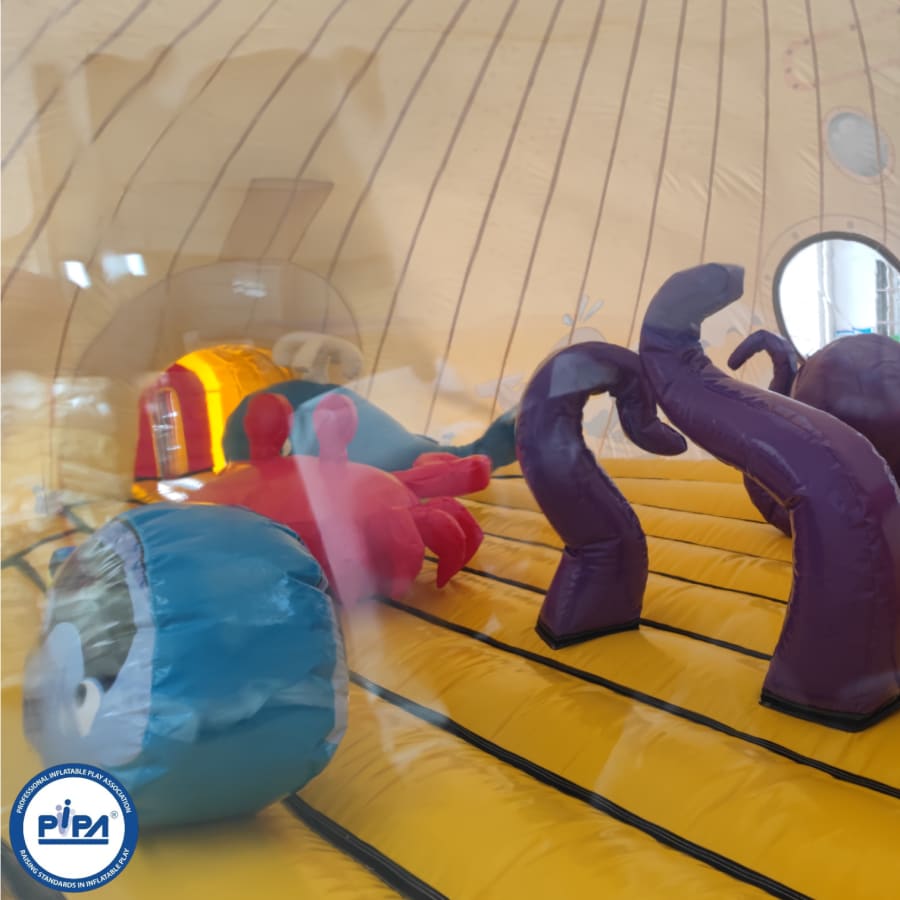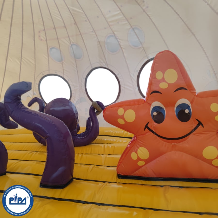 Prepare for an epic journey as you navigate through this extraordinary adventure. Begin your expedition with a safe and visually captivating entrance way that sets the tone for the undersea adventure ahead. Dive into a world of challenges, including biff and bash pillars resembling your favourite sea creatures, creating a dynamic and fun-filled sea world bouncy castle experience.
