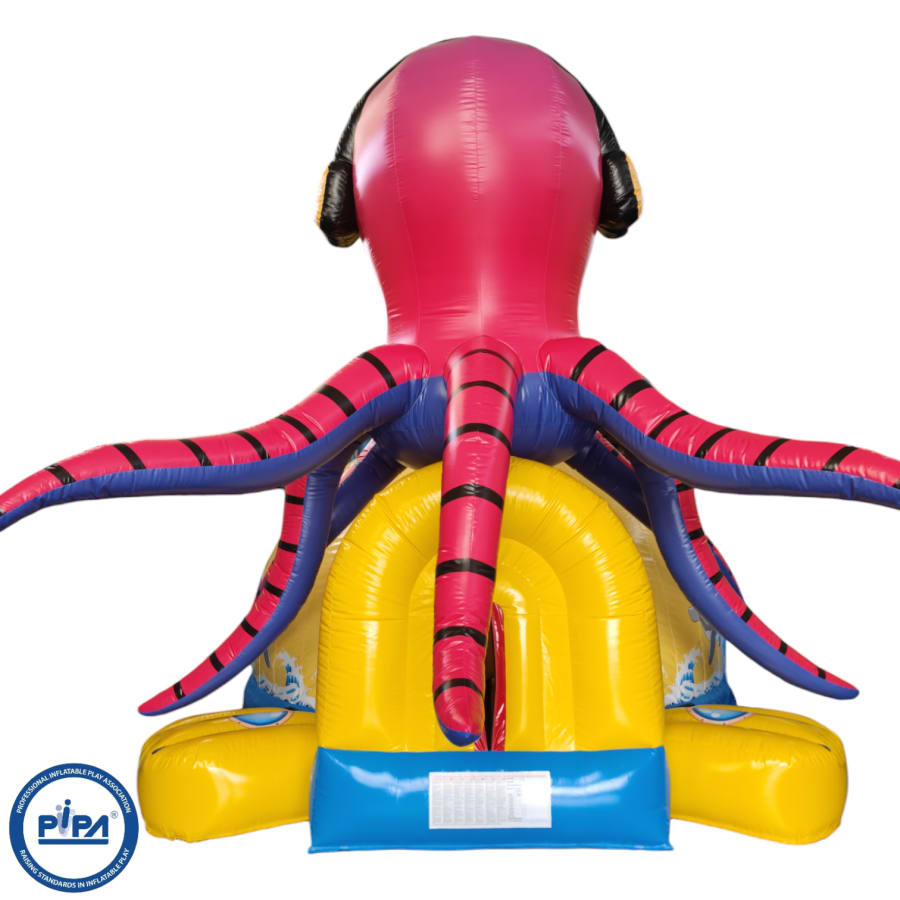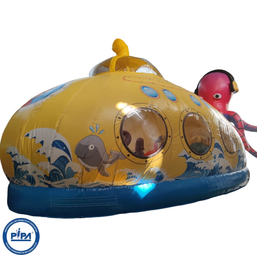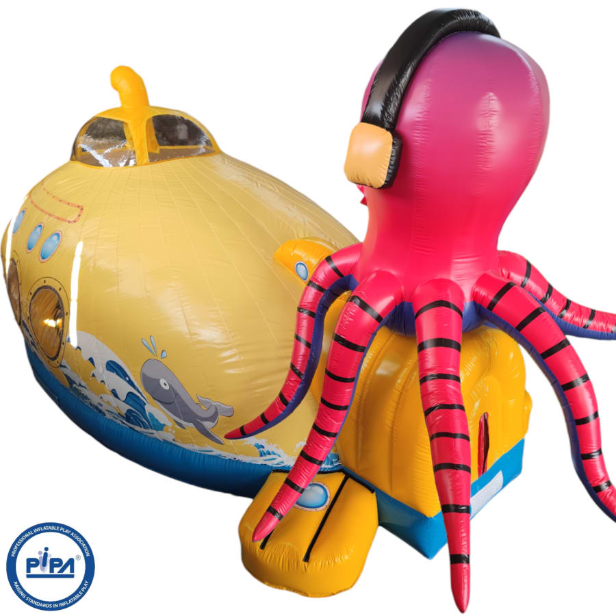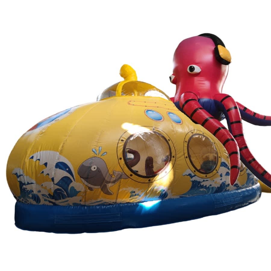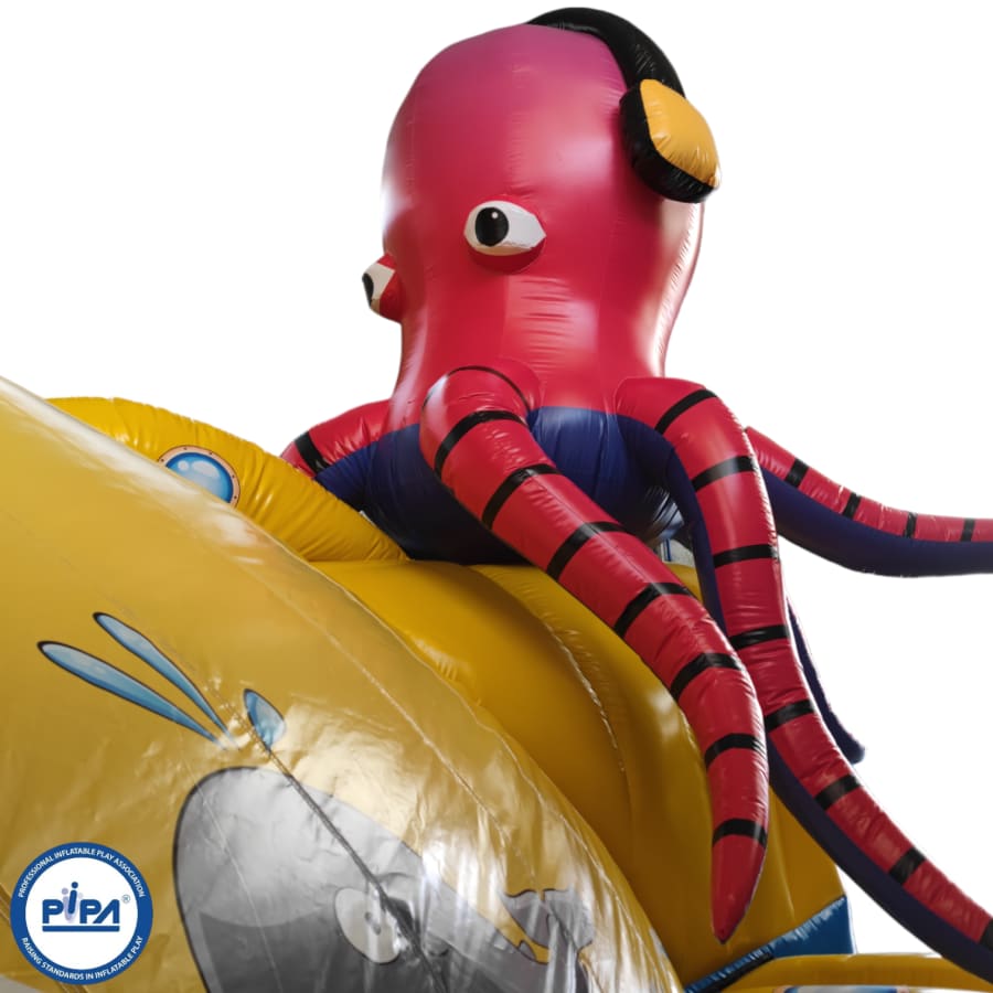 Immerse yourself in the incredible detail of this 3D inflatable wonder, featuring a colossal submarine structure with intricate artwork that brings the deep sea to life. At the top of the submarine, a massive octopus looms, its tentacles reaching out as if to challenge anyone brave enough to conquer this aquatic bouncy castle.