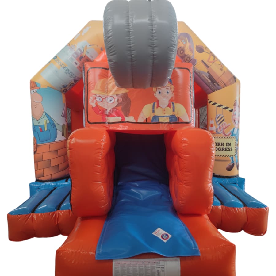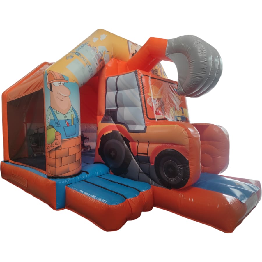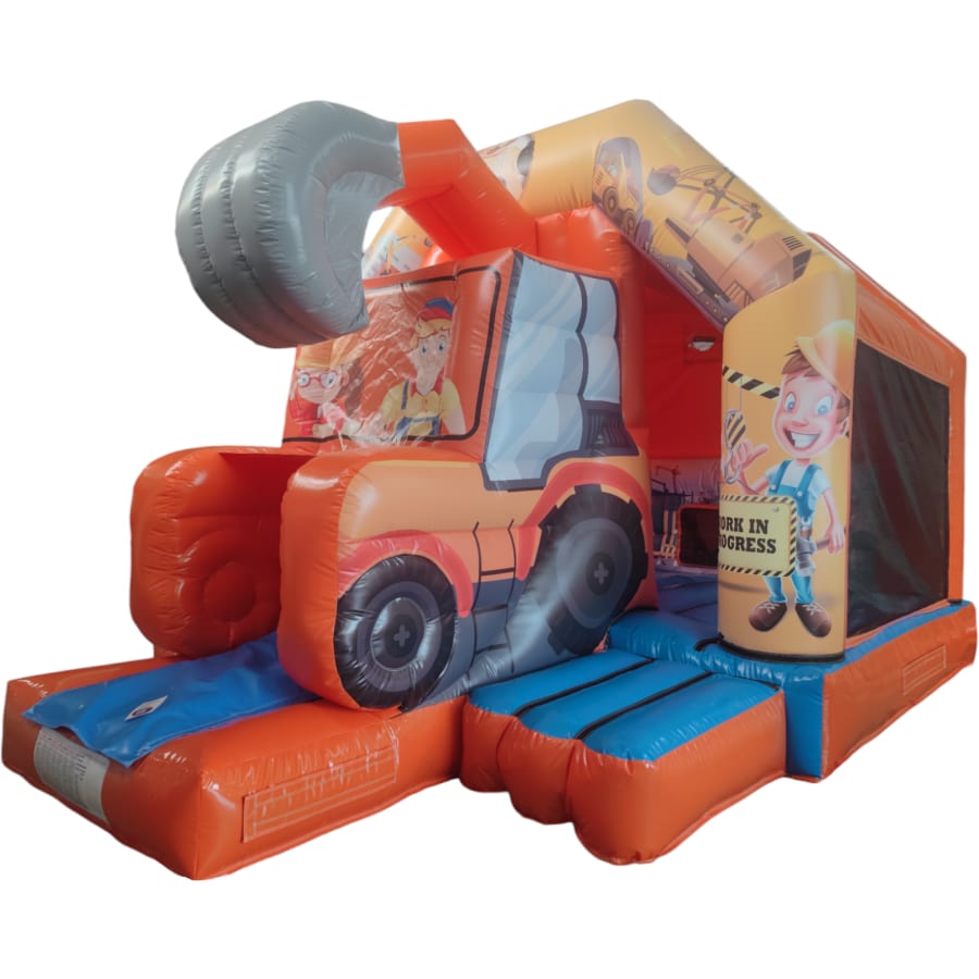 The JCB digger bouncy castle with slide combines 2 of the most popular items we manufacture in one extraordinary inflatable where space is at a premium. The JCB digger bouncy castle with slide combo is the perfect combination slide for any party, venue or occasion and is ideal for all age groups. This brightly coloured piece of equipment provides the perfect bouncing area to bounce along with friends, whilst the slide provides entertainment for the rest of the guests at the same time and certainly won't break the bank for the creativity it brings. This will be a battery powered design as standard but can be pre-wired upon request.