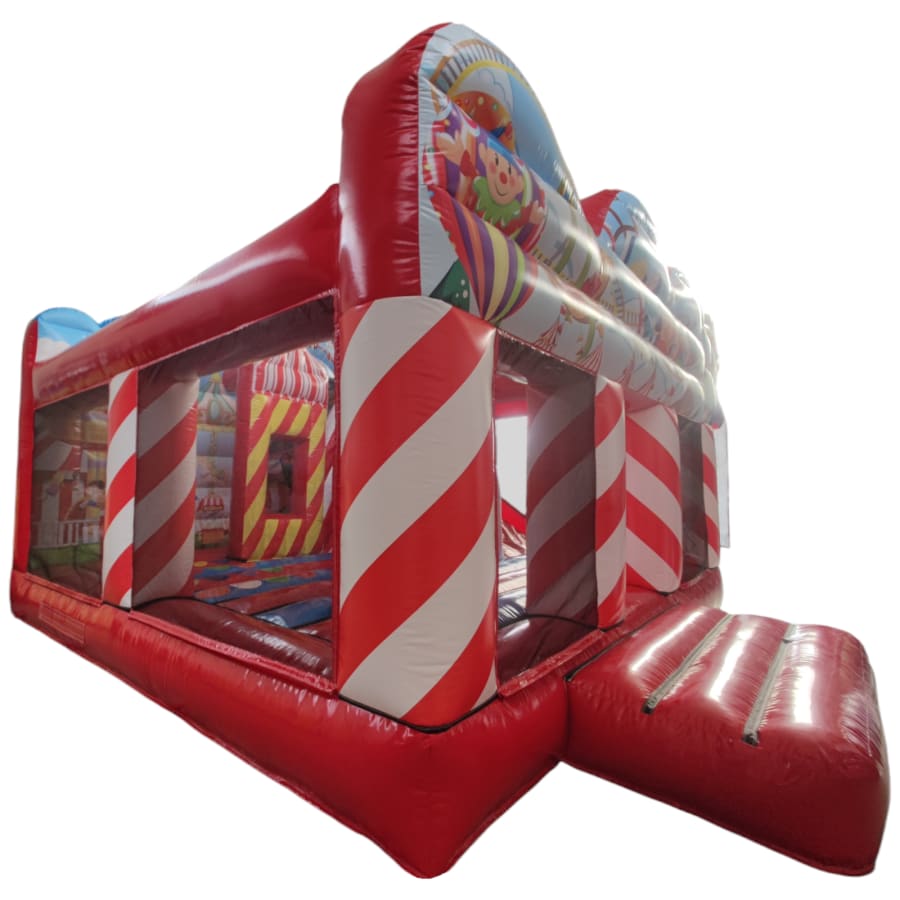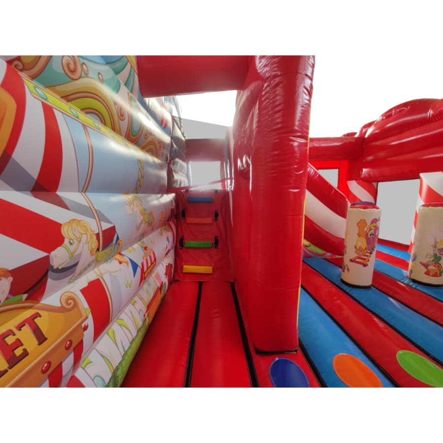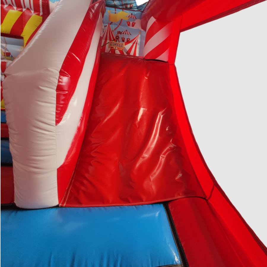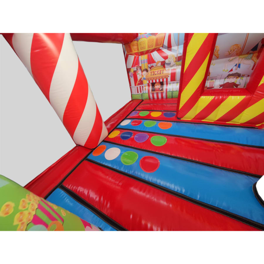The inflatable funfair is themed up to replicate the look of the old town Fun-house seen at traditional fairgrounds worldwide and it's bound to bring all these childhood memories flooding back. It features a twister game style pay bed, carousel themes side wall, A circus stage arena, A punch and Judy style side stall, Interactive biff and bash pillars & features a slide in the corner and generally just an amazing funfair themed inflatable with an added bonus of a fully adult compliant bouncy castle designed specifically for all you big kids in life.
