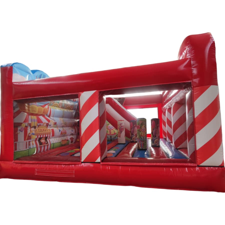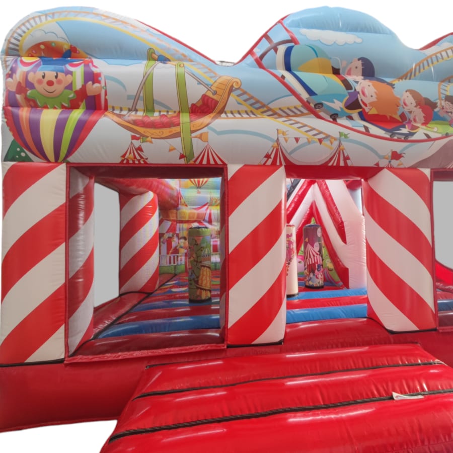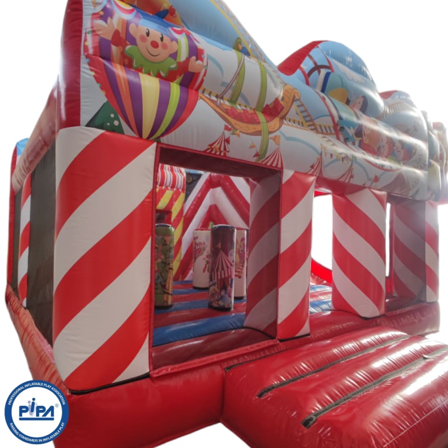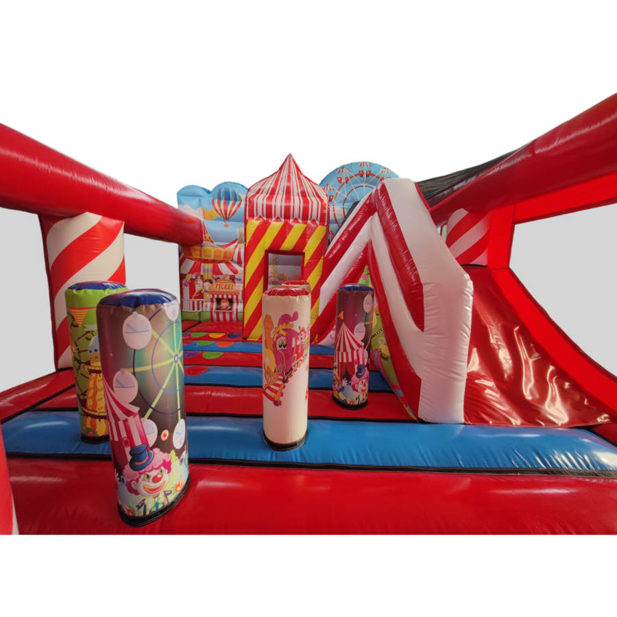 The inflatable funfair is themed up to replicate the look of the old town Fun-house seen at traditional fairgrounds worldwide and it's bound to bring all these childhood memories flooding back. It features a twister game style pay bed, carousel themes side wall, A circus stage arena, A punch and Judy style side stall, Interactive biff and bash pillars & features a slide in the corner and generally just an amazing funfair themed inflatable with an added bonus of a fully adult compliant bouncy castle designed specifically for all you big kids in life.