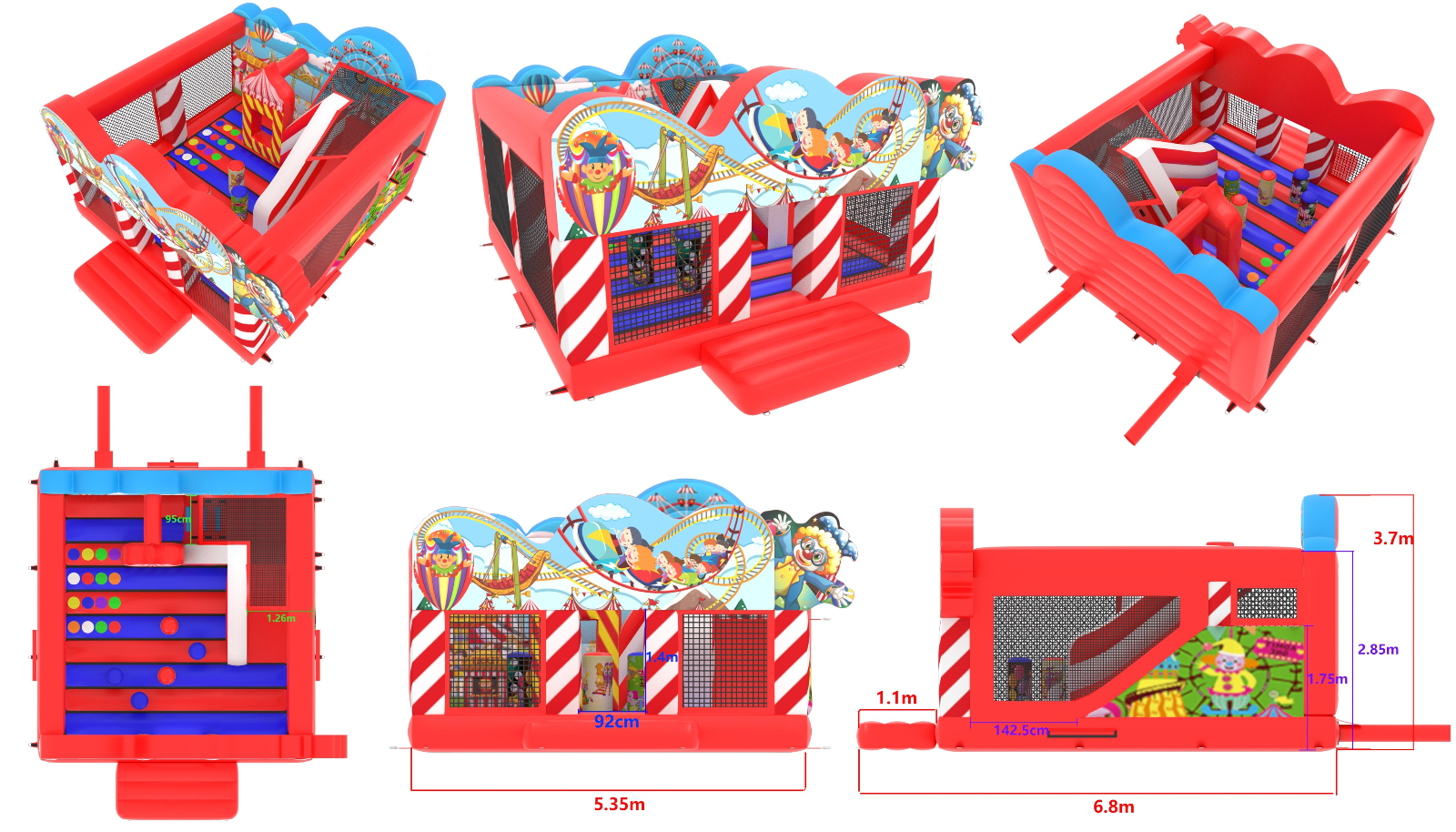 The inflatable funfair is themed up to replicate the look of the old town Fun-house seen at traditional fairgrounds worldwide and it's bound to bring all these childhood memories flooding back. It features a twister game style pay bed, carousel themes side wall, A circus stage arena, A punch and Judy style side stall, Interactive biff and bash pillars & features a slide in the corner and generally just an amazing funfair themed inflatable with an added bonus of a fully adult compliant bouncy castle designed specifically for all you big kids in life.