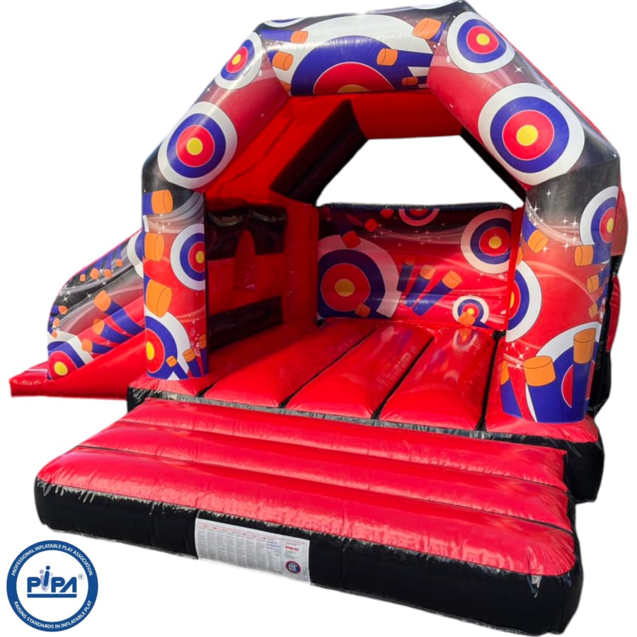 Measuring 16x15ft, this castle has long been the backbone of the UK inflatable hire industry. We’ve enhanced this classic design by:
