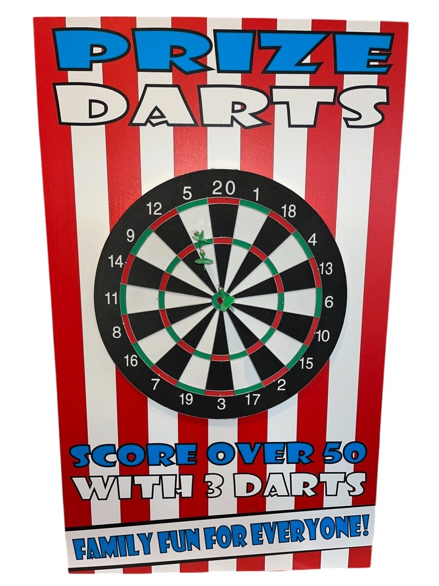 The aim of this funfair game is to throw three darts and score over 50 to win the game or a prize depending on how you have set up for the day.