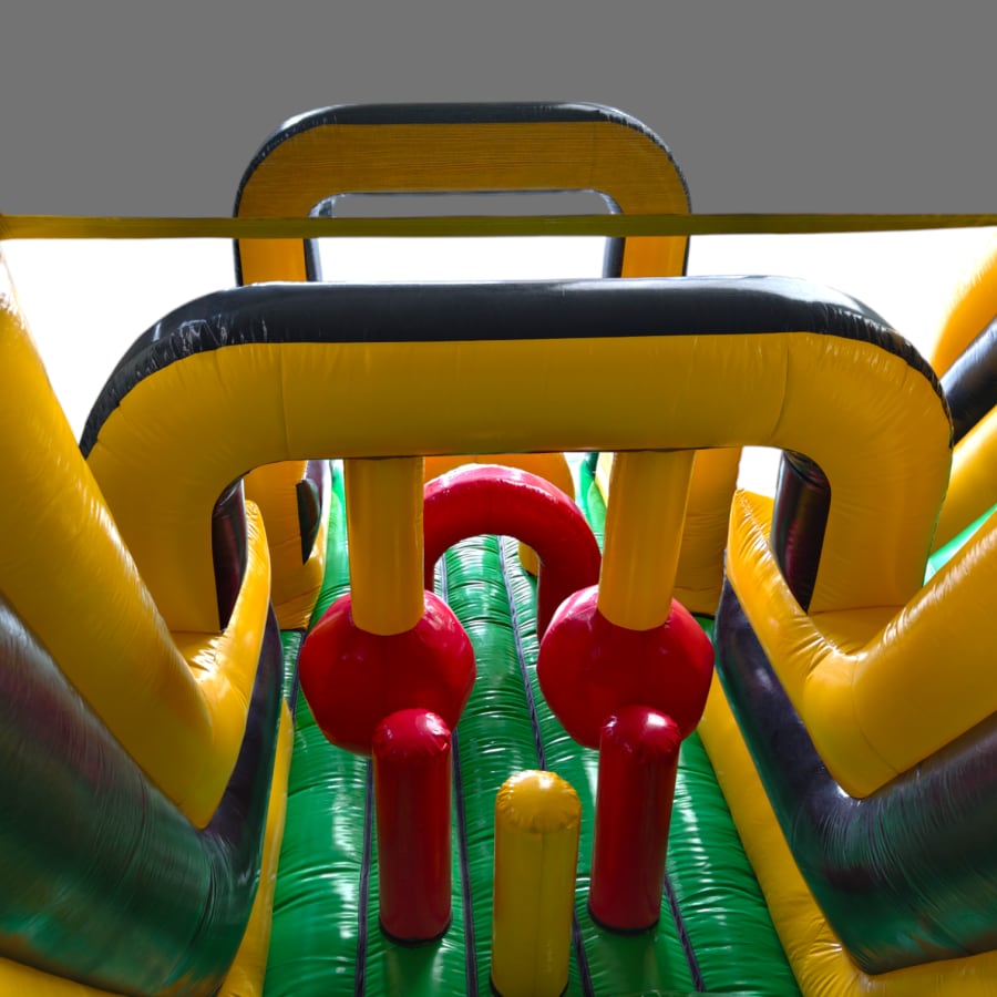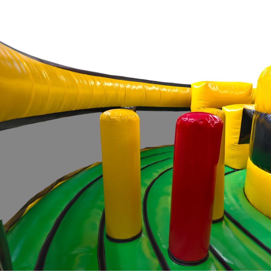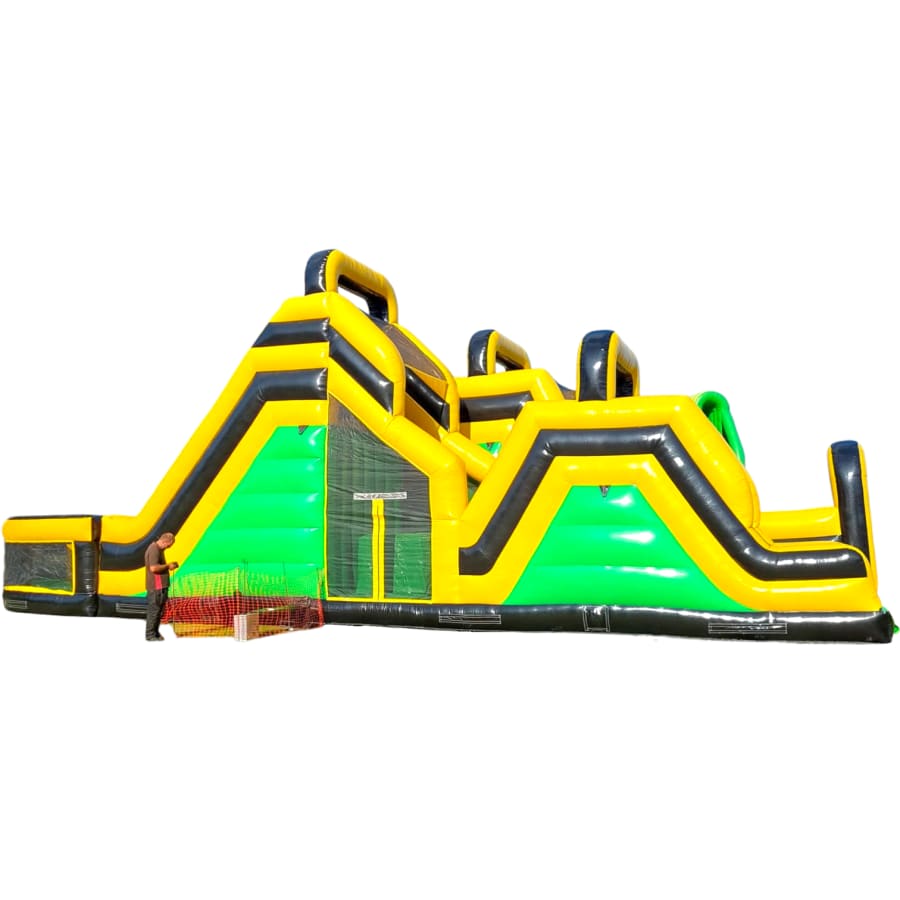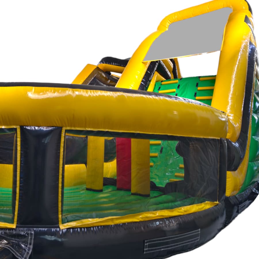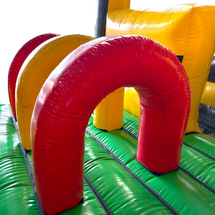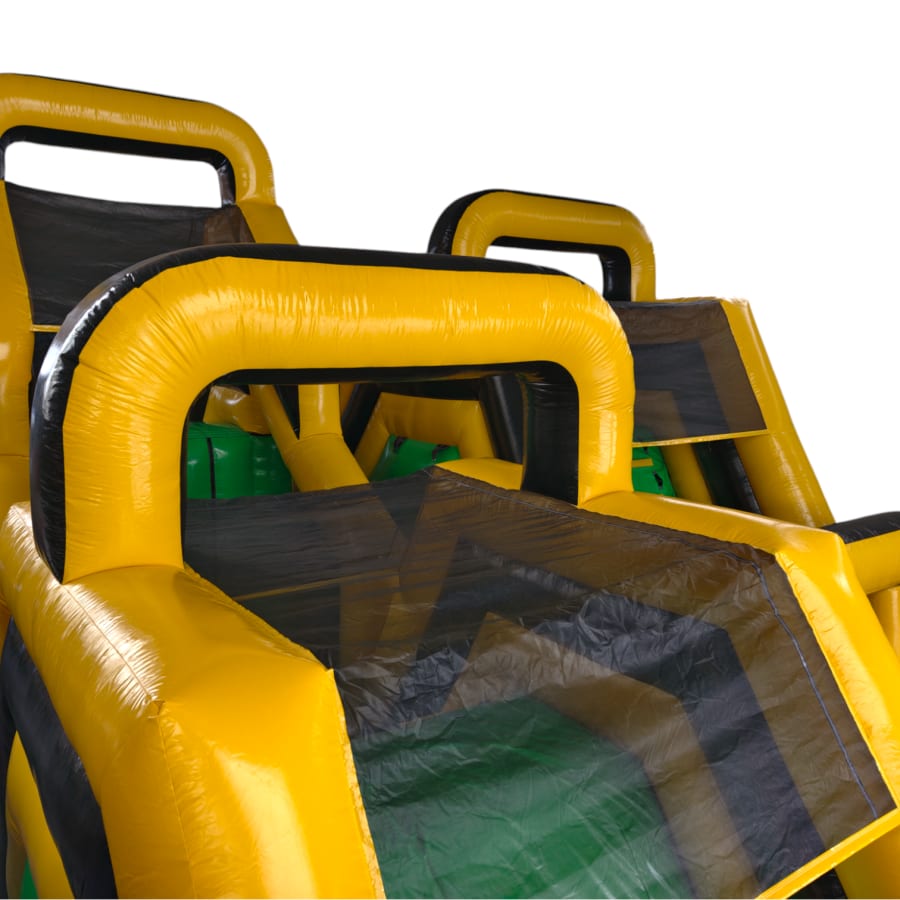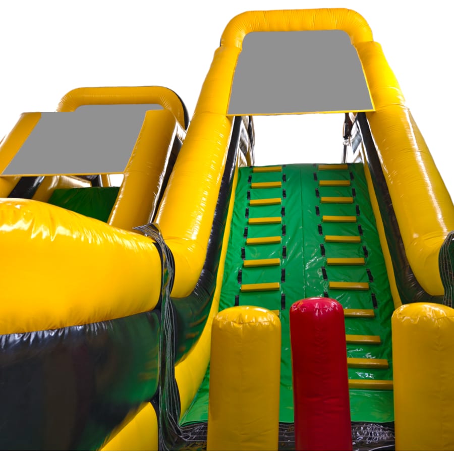 This inflatable is built in three modular sections for flexibility and practicality. Featuring two massive 8ft platform slides, the entire course flows seamlessly with climb-throughs, biff and bash posts, obstacle humps, hoops, tunnels, crawls, and so much more.