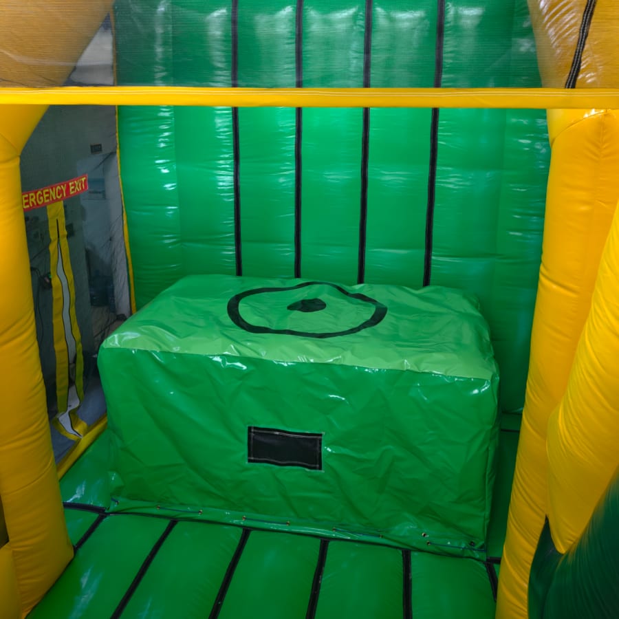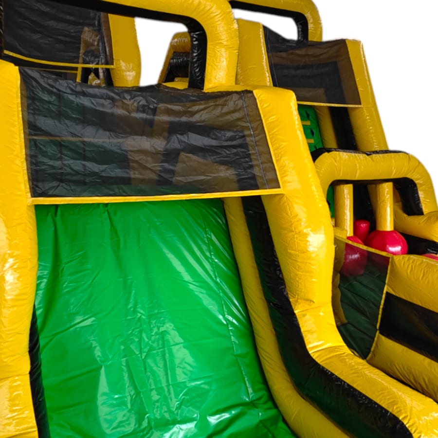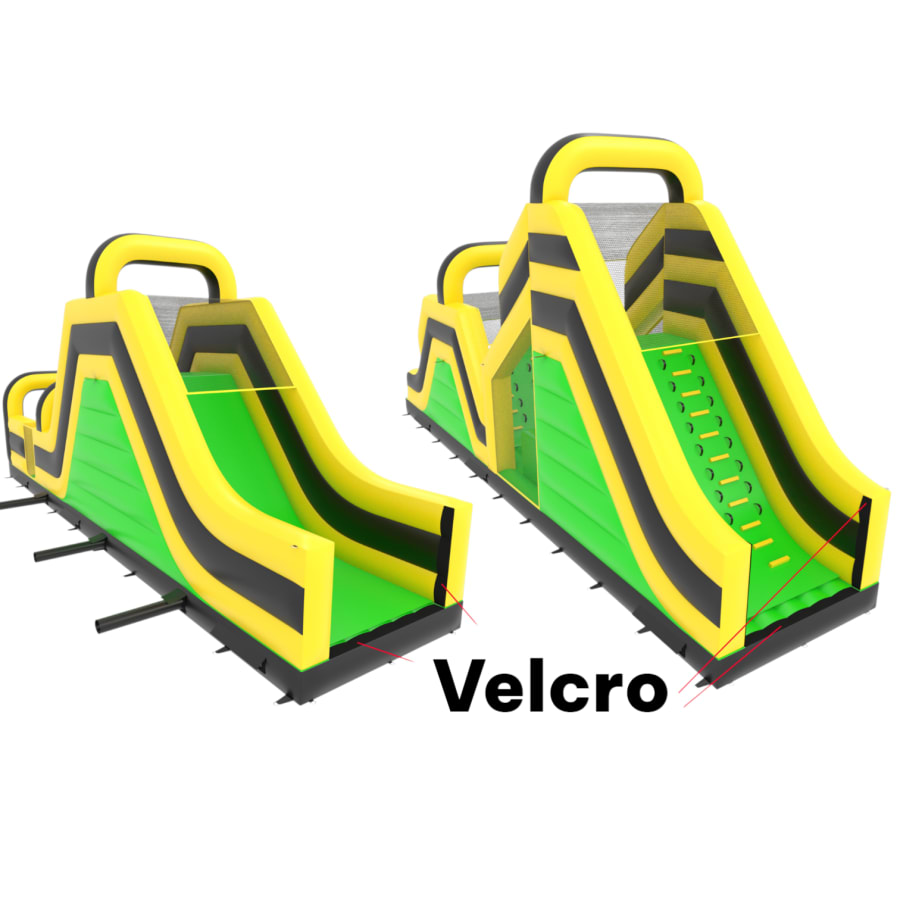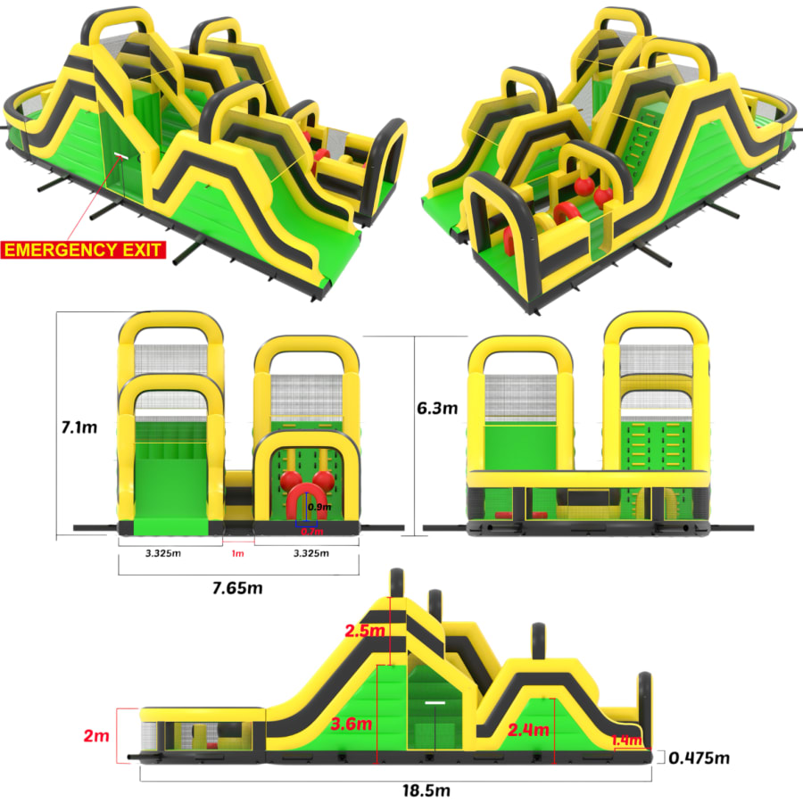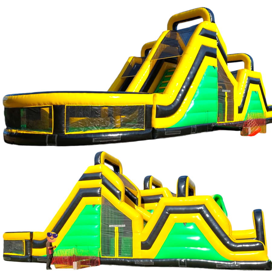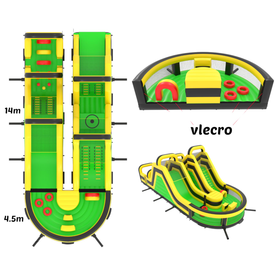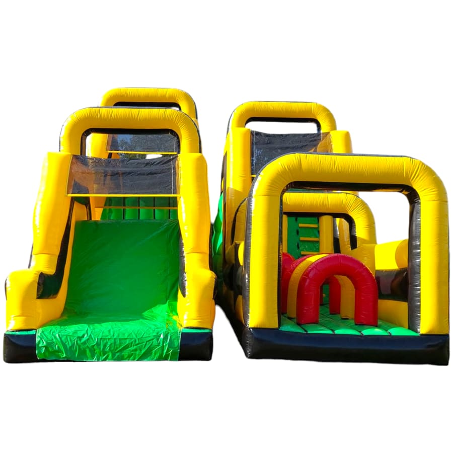 This inflatable is built in three modular sections for flexibility and practicality. Featuring two massive 8ft platform slides, the entire course flows seamlessly with climb-throughs, biff and bash posts, obstacle humps, hoops, tunnels, crawls, and so much more.