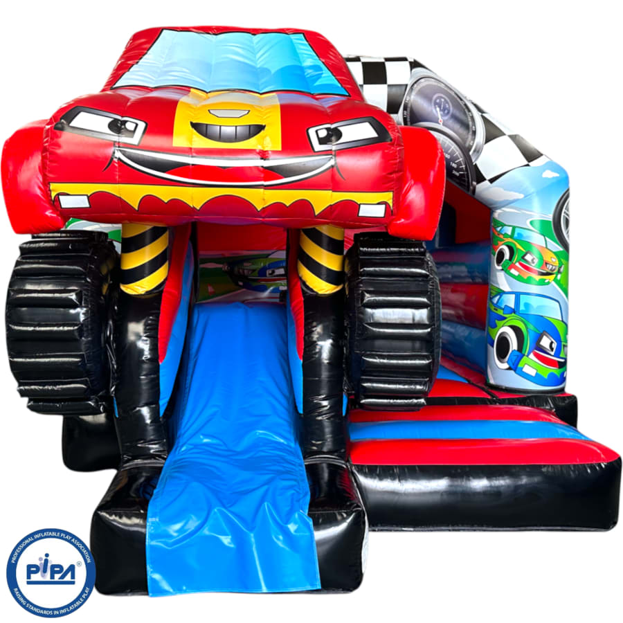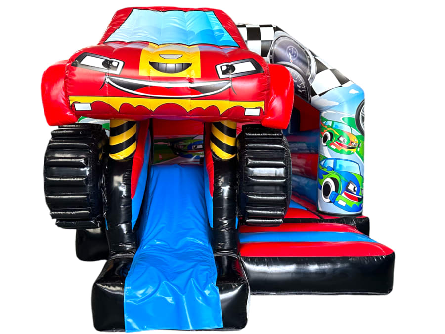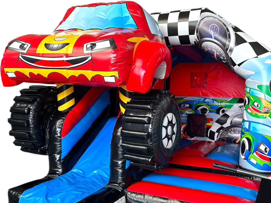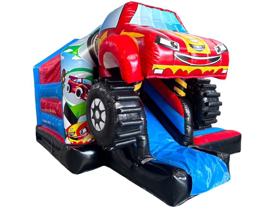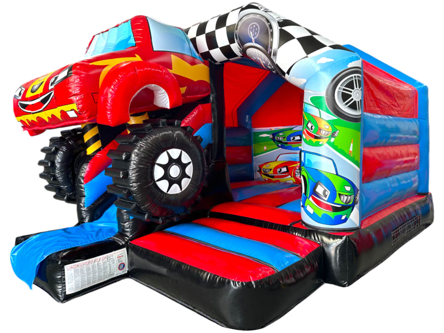 3D bouncy castle, bouncy castle combo, Monster Truck inflatable, inflatable with slide, 3D inflatable bouncy castle, kids party inflatable, moonwalk inflatable, funfair themed bouncy castle, bouncy castle hire UK, inflatable slide combo, indoor bouncy castle hire, front slide inflatable, disco-ready bouncy castle