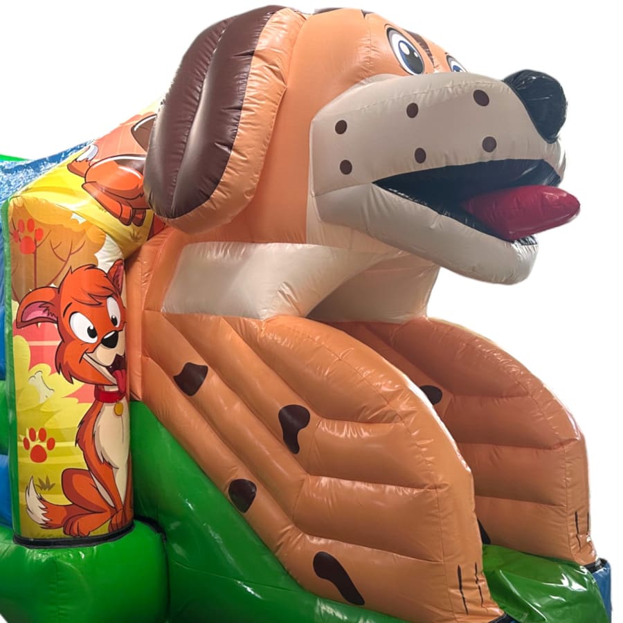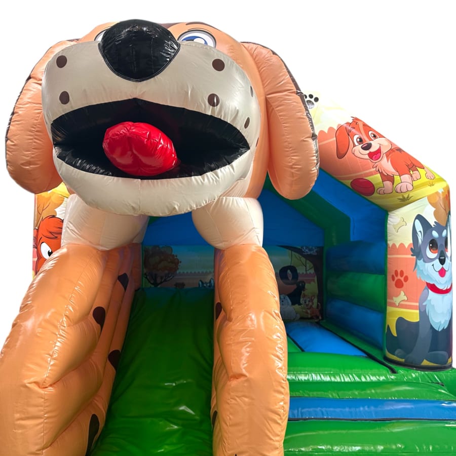 3D bouncy castle, bouncy castle combo, Puppy inflatable, inflatable with slide, 3D inflatable bouncy castle, kids party inflatable, moonwalk inflatable, funfair themed bouncy castle, bouncy castle hire UK, inflatable slide combo, indoor bouncy castle hire, front slide inflatable, disco-ready bouncy castle