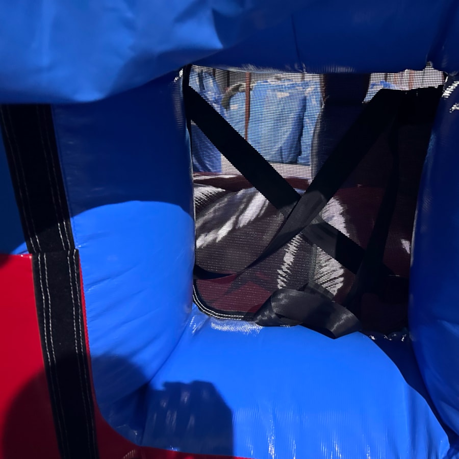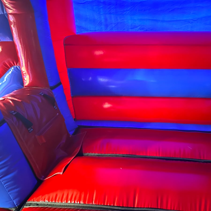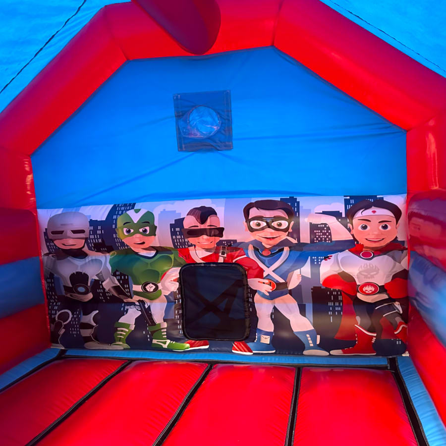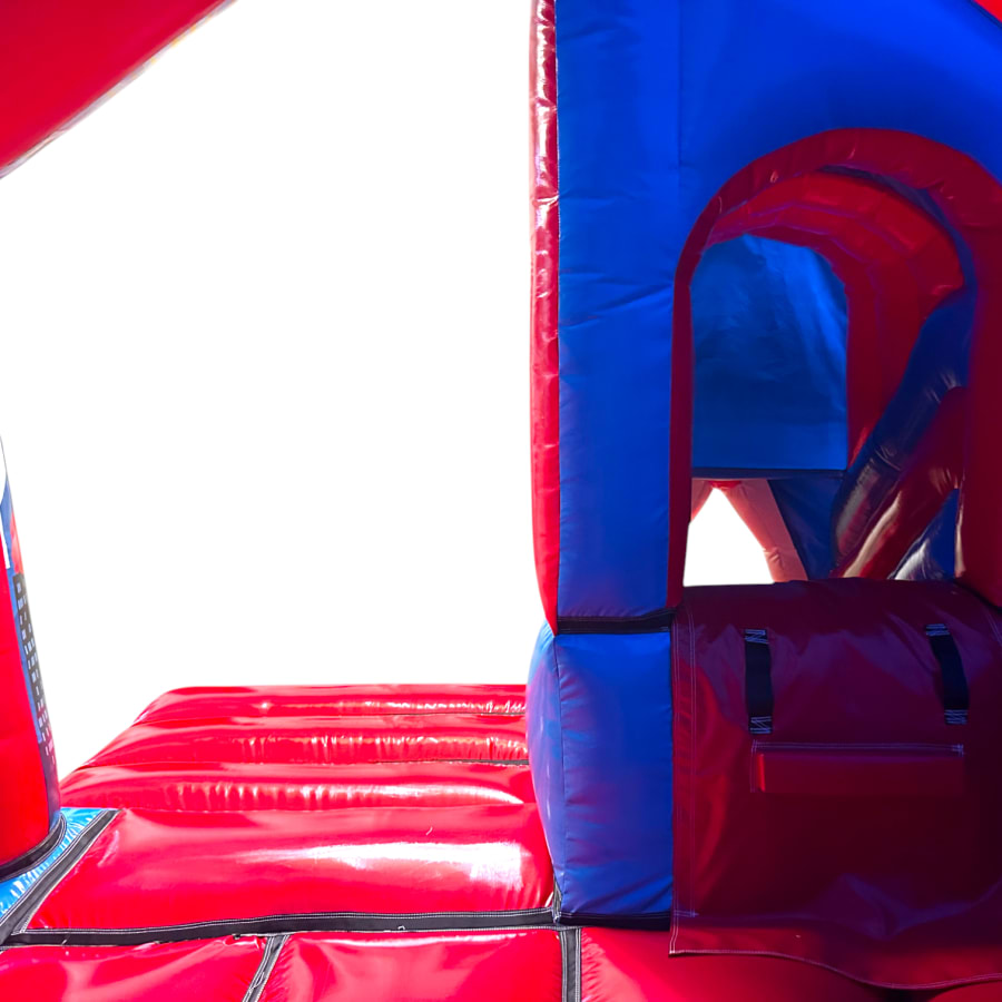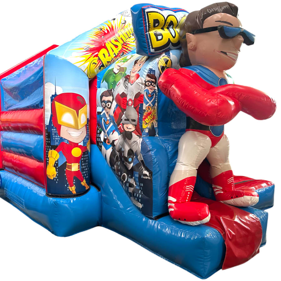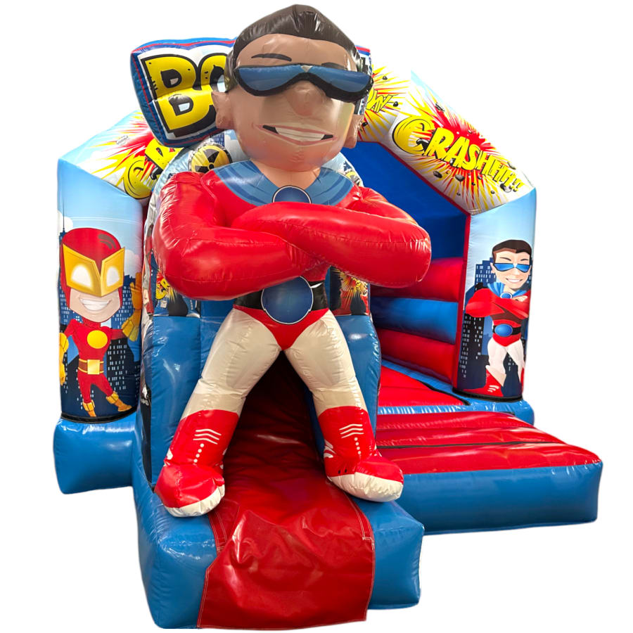 3D bouncy castle, bouncy castle combo, Superhero inflatable, inflatable with slide, 3D inflatable bouncy castle, kids party inflatable, moonwalk inflatable, funfair themed bouncy castle, bouncy castle hire UK, inflatable slide combo, indoor bouncy castle hire, front slide inflatable, disco-ready bouncy castle