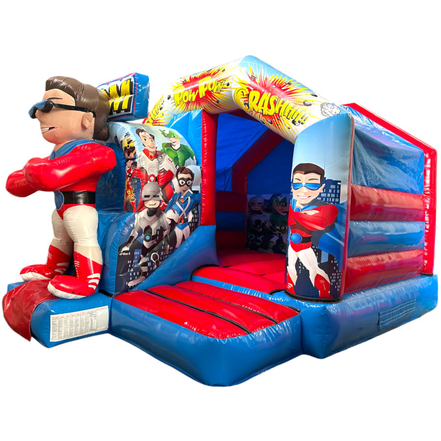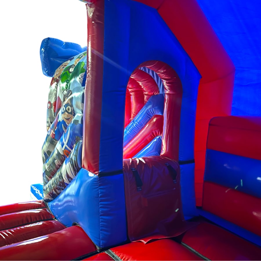 New Epic 3D Low Height Bouncy Castle with Slide - Superhero Themed Front Slide Combo