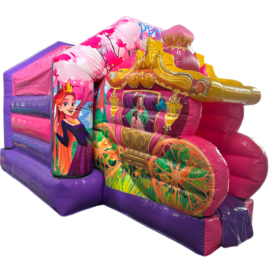 New Epic 3D Low Height Bouncy Castle with Slide - Princess Carriage Themed Front Slide Combo