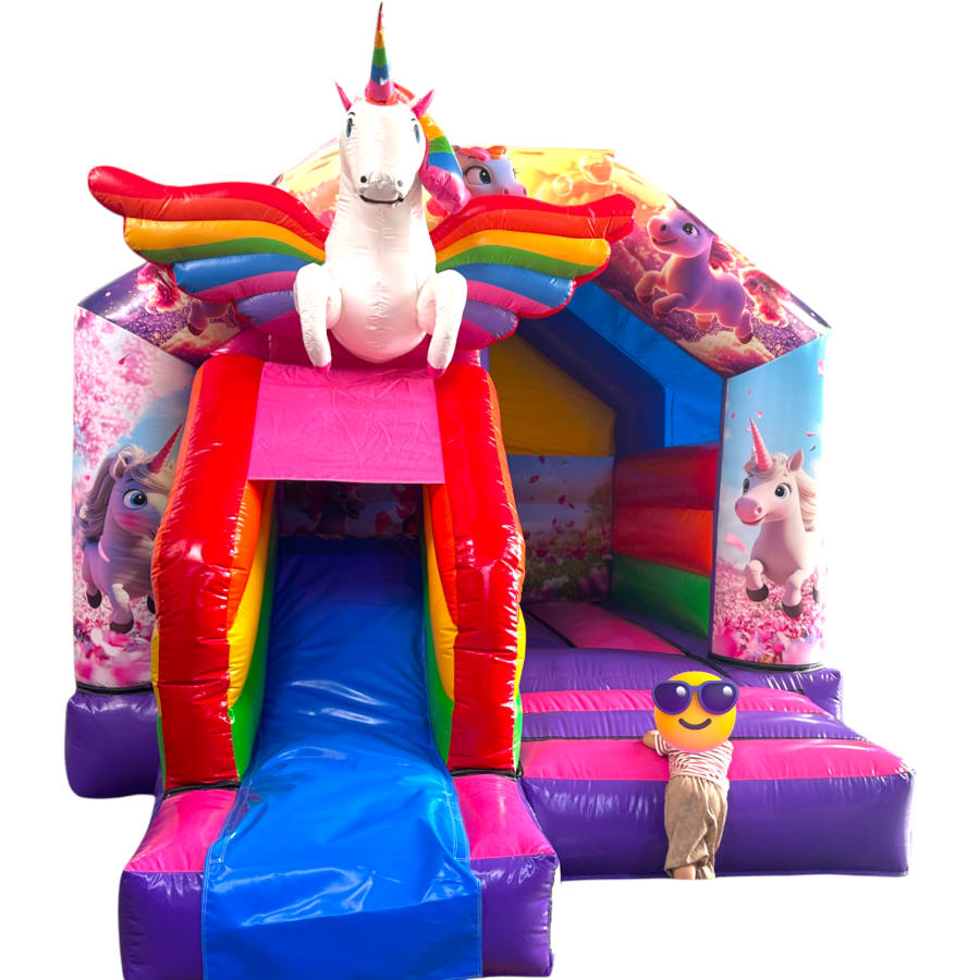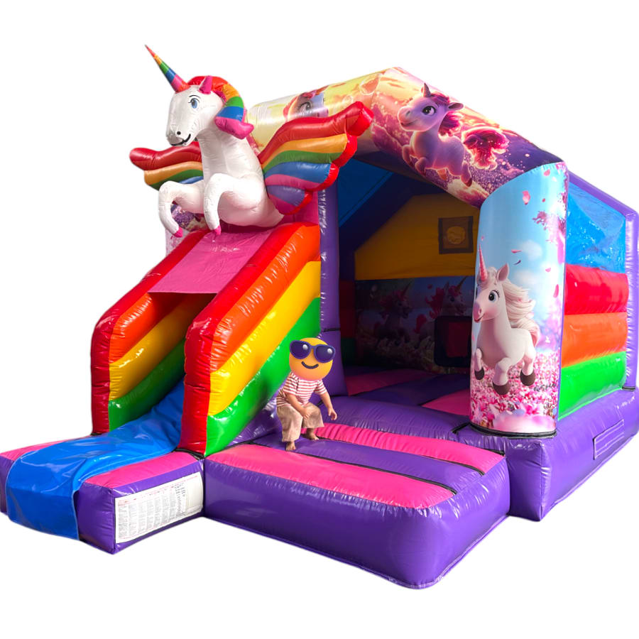3D bouncy castle, bouncy castle combo, Unicorn inflatable, inflatable with slide, 3D inflatable bouncy castle, kids party inflatable, moonwalk inflatable, funfair themed bouncy castle, bouncy castle hire UK, inflatable slide combo, indoor bouncy castle hire, front slide inflatable, disco-ready bouncy castle