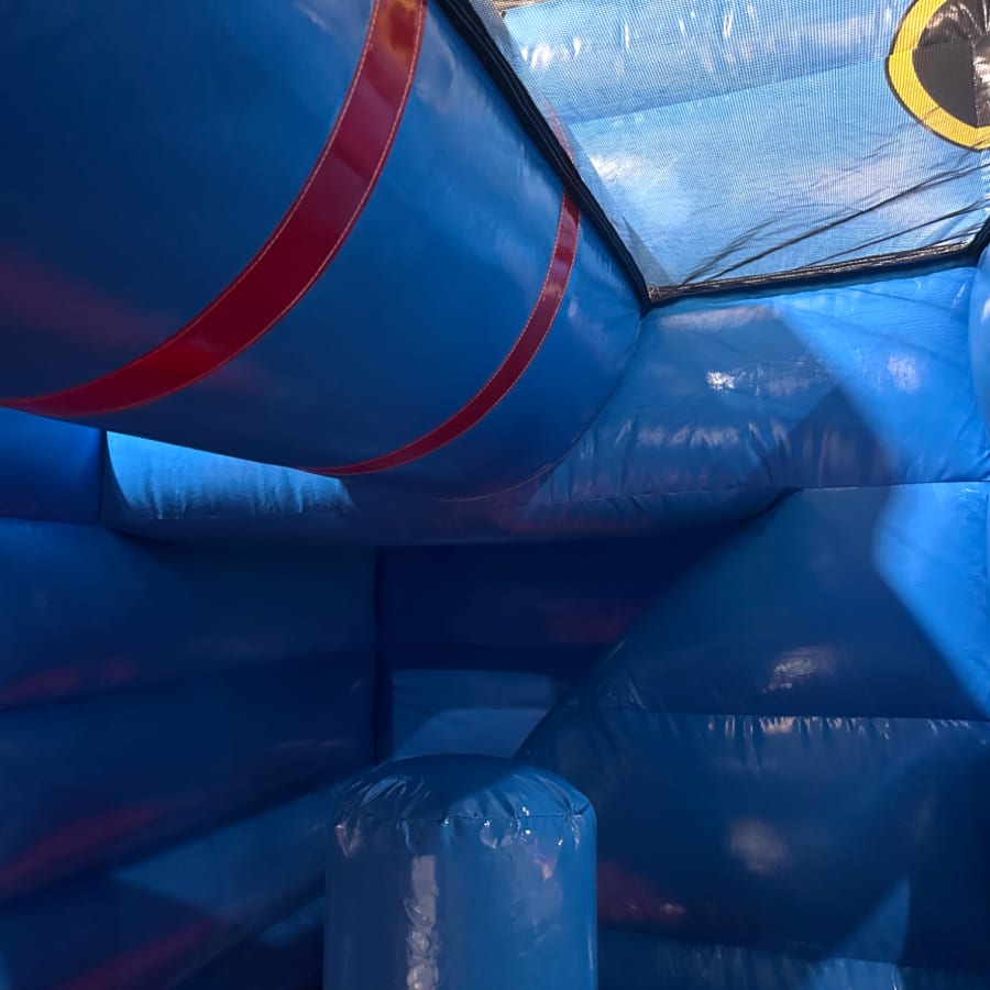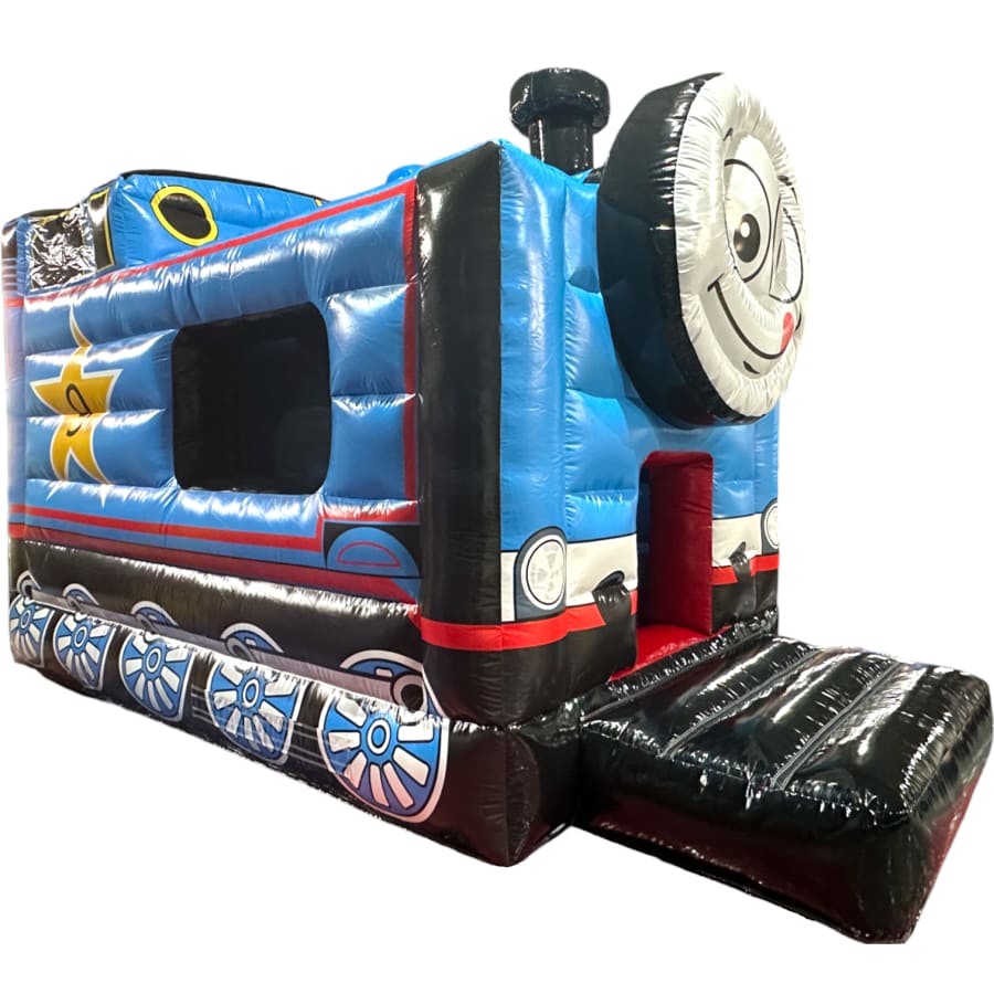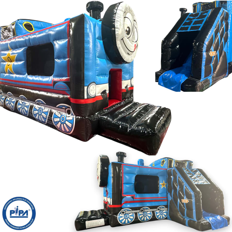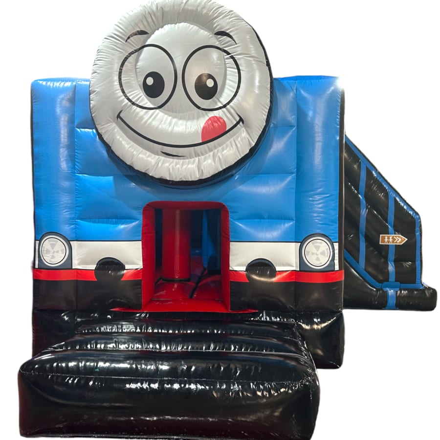 3D bouncy castle, bouncy castle combo, Train inflatable, inflatable with slide, 3D inflatable bouncy castle, kids party inflatable, moonwalk inflatable, funfair themed bouncy castle, bouncy castle hire UK, inflatable slide combo, indoor bouncy castle hire, front slide inflatable, disco-ready bouncy castle