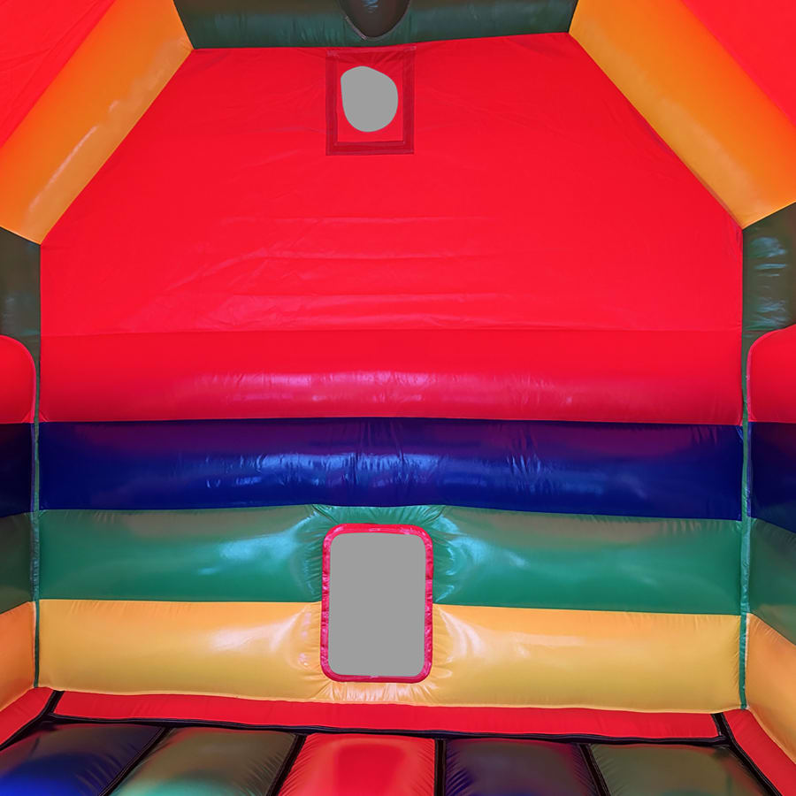 The Inflatable Disco Castle comes with a lighting slot in the top that accepts most kinds of disco lighting, this is placed inside a clear plastic tube that allows light to penetrate inside the castle creating some really good effects inside. The slot is then zipped closed and a velcro cap is placed over to keep it watertight but please bear with us in heavy rain as nothing is quite 100% waterproof