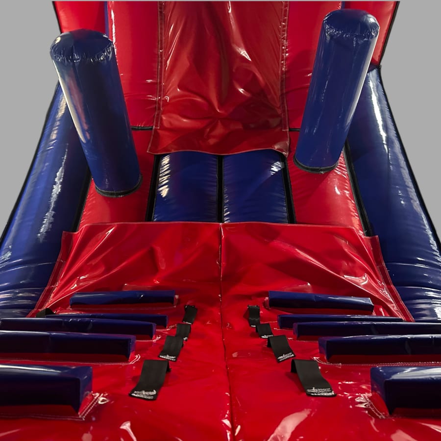 Users enter through a fully themed entrance before tackling a series of biff and bash pillars, moving through a central bouncing area, then progressing up a challenging climb before finishing with an exciting slide exit. The layout has been carefully designed to keep participants moving and engaged, making it ideal for busy events and repeat use throughout the day.