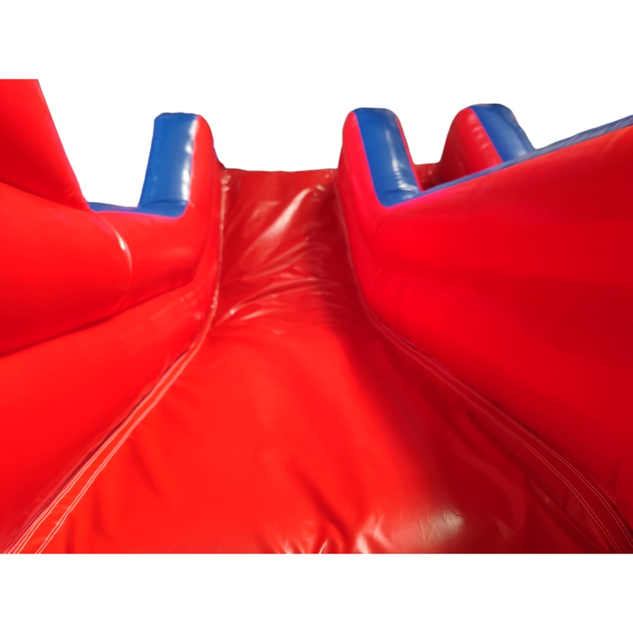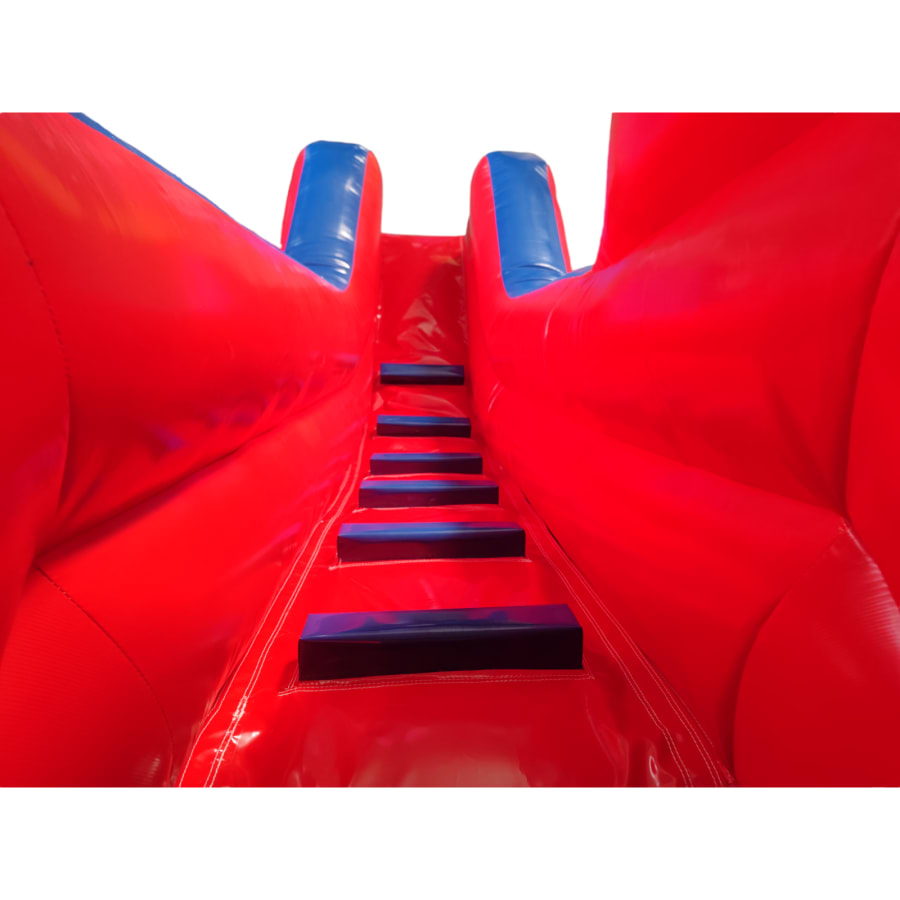 The side comes complete with detachable steps and slip sheet is a real head turner for the kids. The inflatable slide comes with detachable foam block steps, detachable slip sheet, light weight netted slide canopy. The slides roof features a special viewing tower for the little ones to get excited over and despite this, only measures at a modest 11ft yet making it perfect for indoor hire. The Bright 4 colour theme really is amazing and give an extra vibrant feel to all other items in its class.