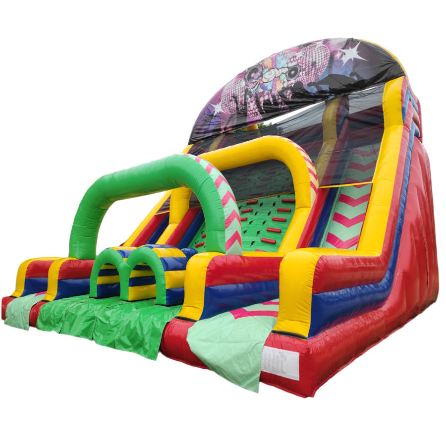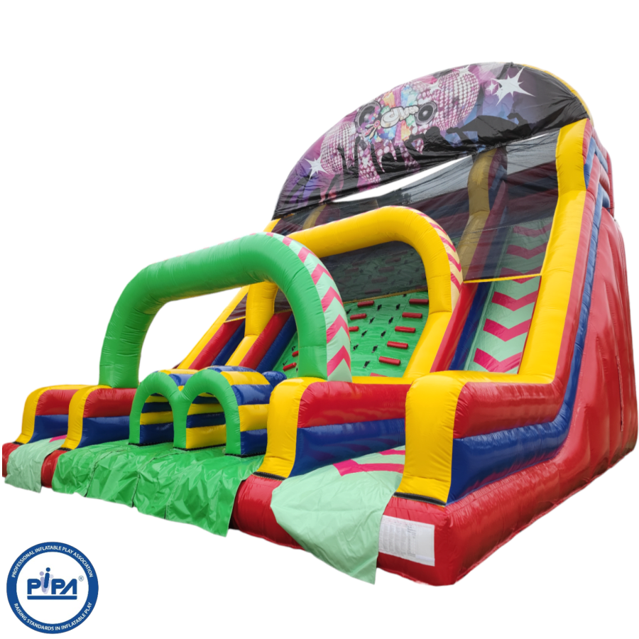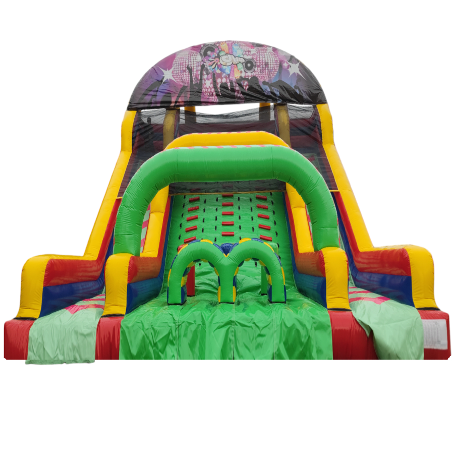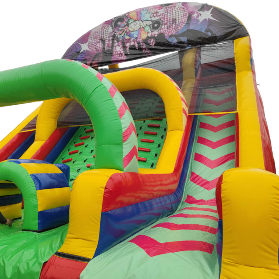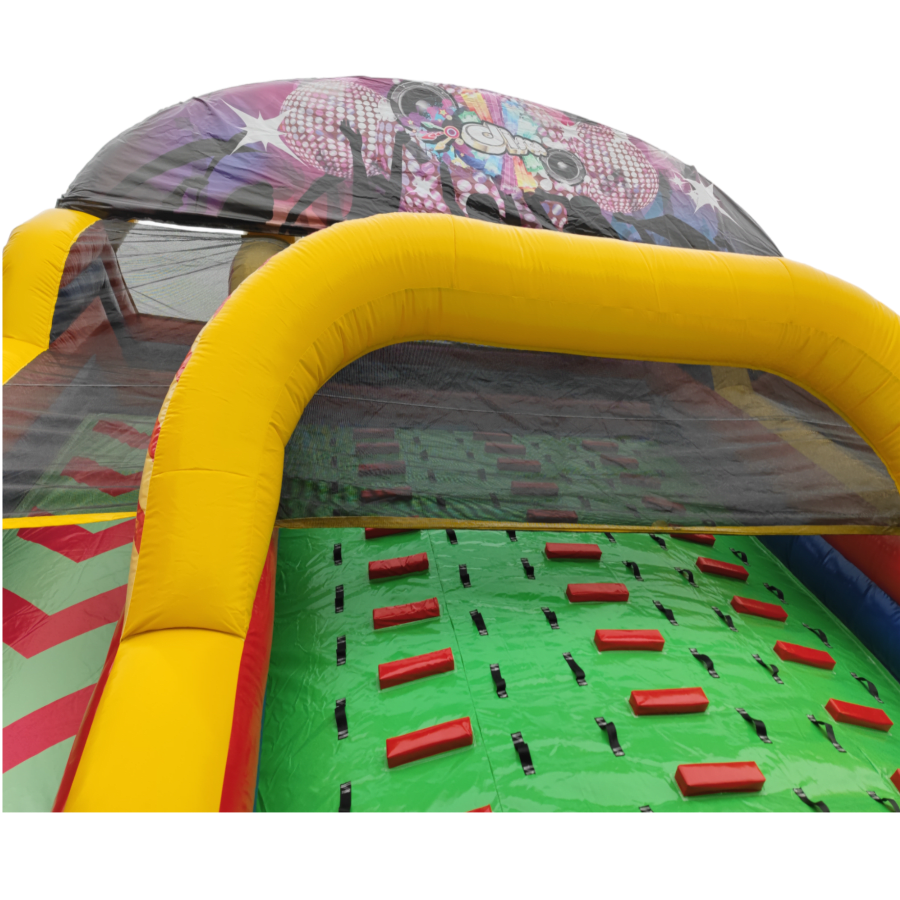 The slide's unique chevron effect resembles the iconic Gladiator Travellator, adding a touch of nostalgia and an extra layer of thrill. At the top section, you'll find dazzling disco-themed artwork, but here's the best part: the artwork is interchangeable with Velcro, so you can customize it to promote your event, change the theme, or update the location as needed.